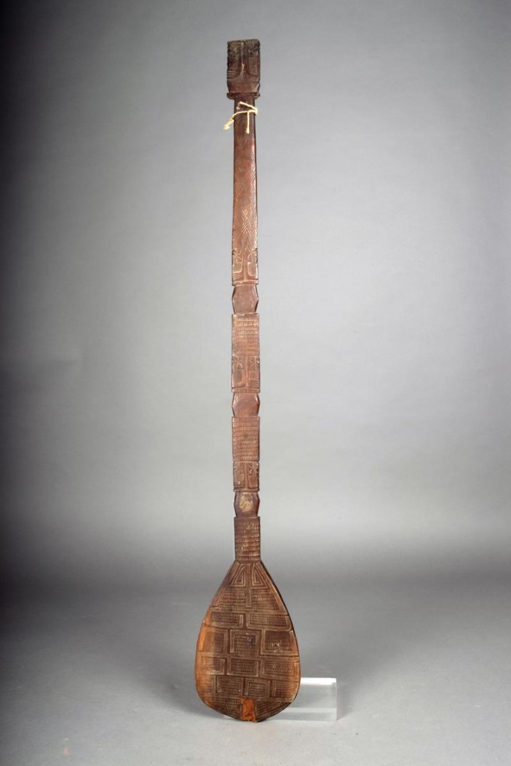 A Marquesas Islands paddle, Polynesia, with a flat ovoid blade and rectangular shaft, carved low relief geometric designs and Janus tiki figures, 95cm long.