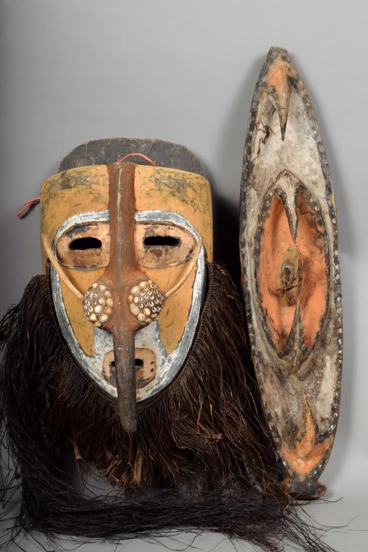 A Papua New Guinea ancestor board, of boat form with four beaks, pigment finish, 72cm high, and a Papua New Guinea mask with a handle, fibre beard, shell and bone decoration with pigment finish, 56cm high. (2)