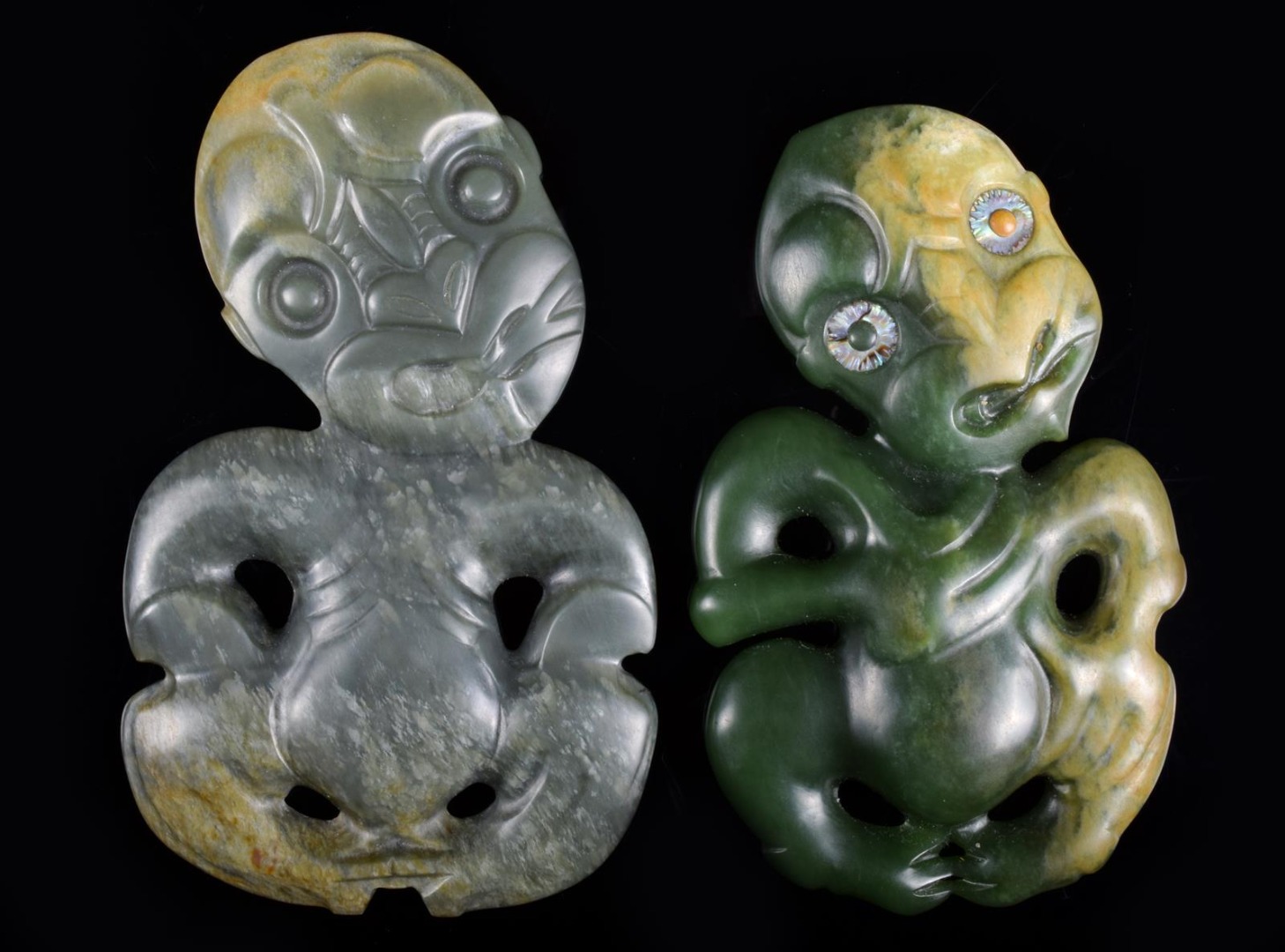 A Maori greenstone hei-tiki pendant, the reverse pierced for attachment and with etched monogram, 12.7cm long and greenstone hei-tiki ornament with abalone shell eyes, 11.6cm long. (2)