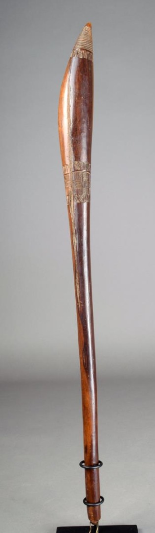 An Aborigine club, with a bulbous pointed head with deep linear and zig zag decoration, the terminal with a pierced loop, with remains of a handwritten label Nulla Nu..., N.S Wales, 61cm long.