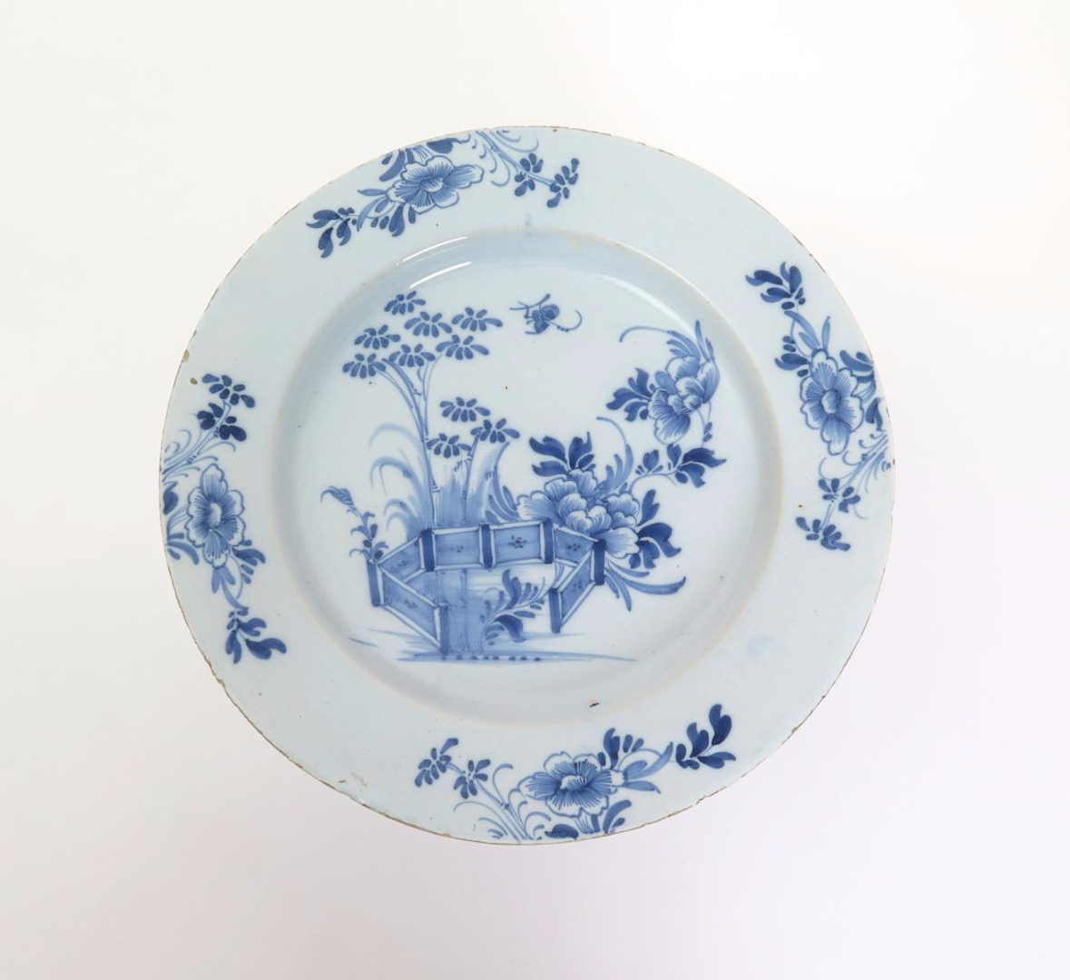A Liverpool delftware charger mid 18th century, painted in blue with bamboo and peony issuing from an ornamental fence, an insect in flight above, the rim with four further sprays of bamboo and peony, 34cm.