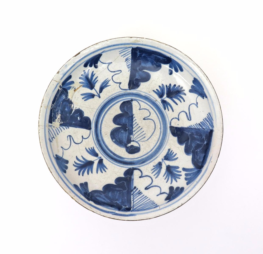 An early delftware oak-leaf charger c.1700, decorated in blue with a typical design of a single oakleaf within four partial leaves and simple foliate sprigs, some damages and repair, 29.2cm.