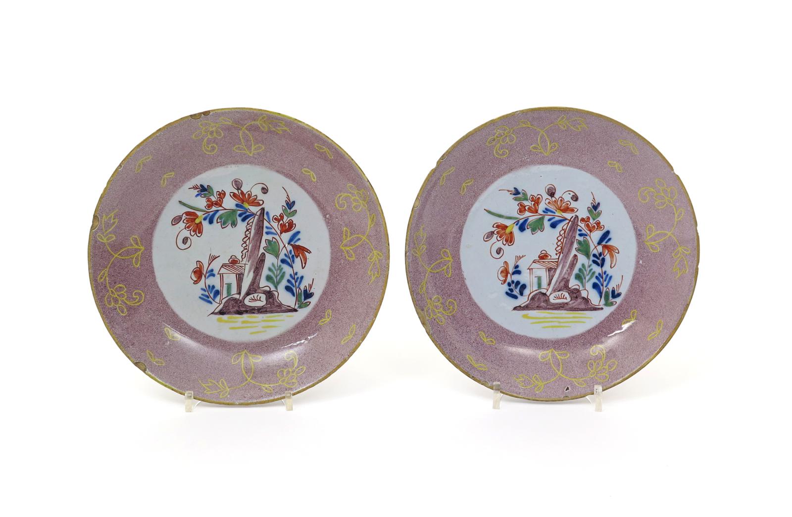 A pair of Lambeth delftware saucer dishes c.1750, the wells decorated in polychrome enamels with tall rockwork and Oriental flowers towering over small buildings, the wide rims with a simple yellow floral design on a powdered manganese ground, small rim chips, 22.2cm. (2)