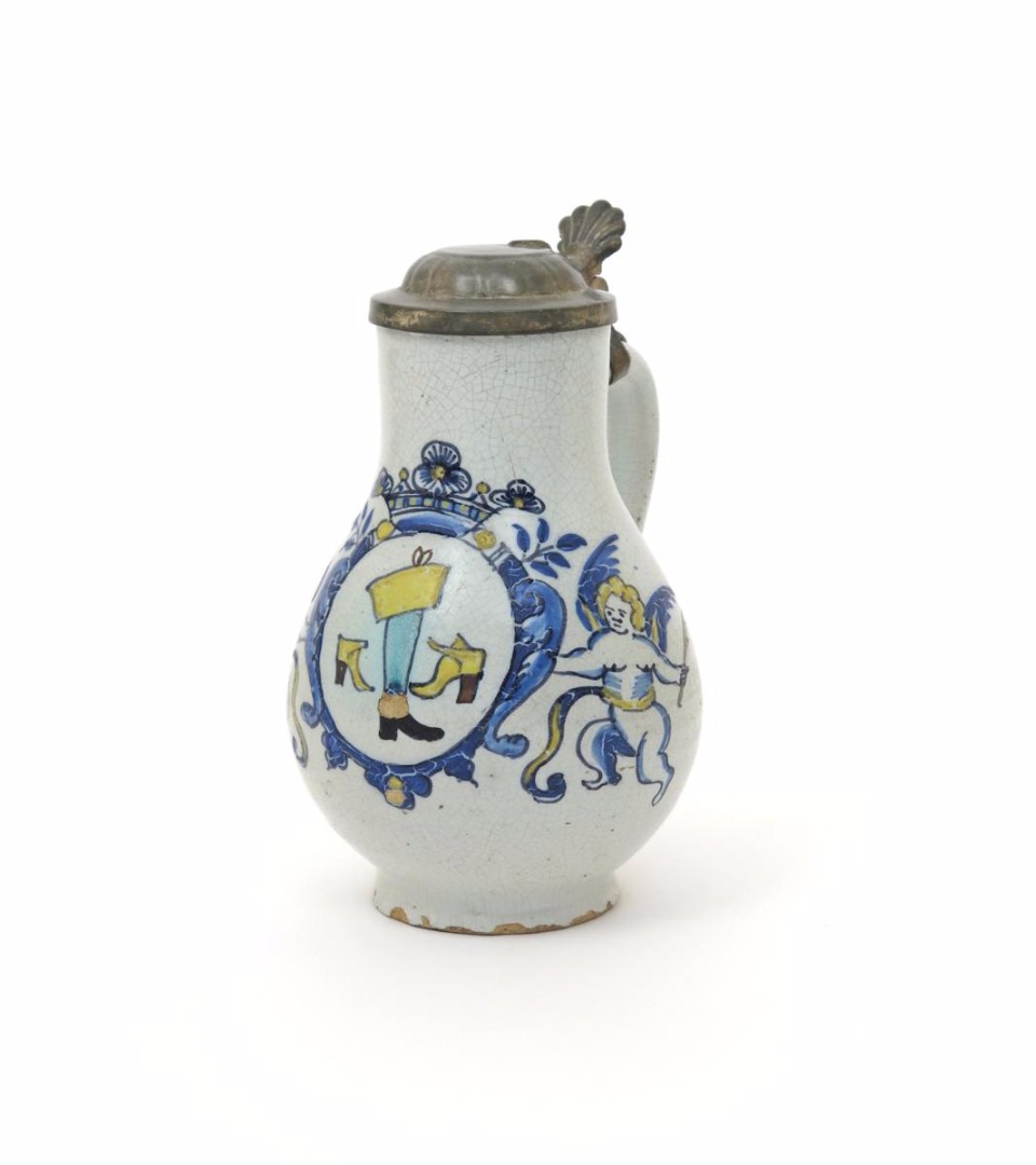 A Delft jug or tankard 18th century, the ovoid body painted in polychrome enamels with two winged putti either side of a circular cartouche containing a tall boot and two shoes, mounted with a hinged pewter lid with shell thumbpiece, minor damages, 20.5cm.