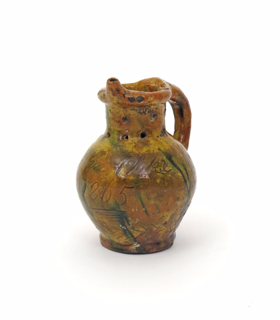 A Donyatt puzzle jug dated 1865, with sgraffito decoration of a man smoking a pipe and a bird perched on a branch, incised 'John Hake 1865', the whole decorated in a mottled green and yellow glaze, 17cm.