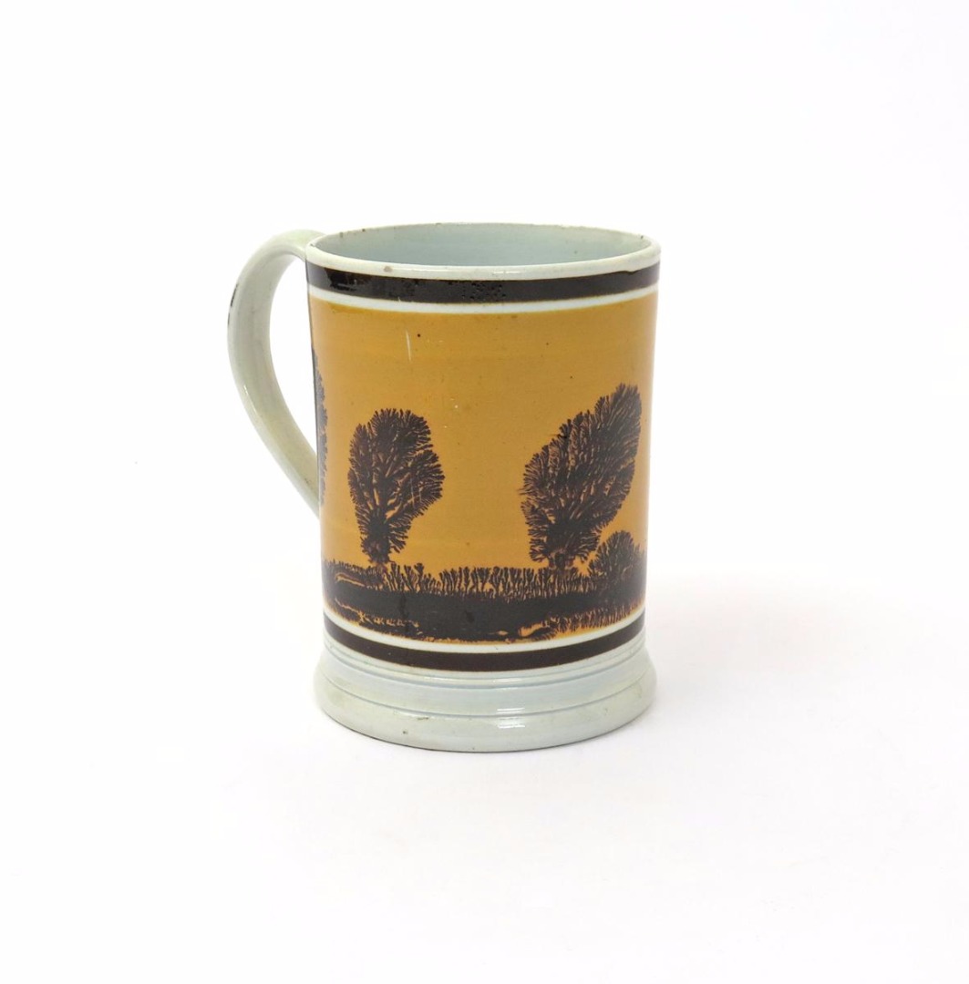 A large mocha ware mug early 19th century, the cylindrical form decorated with a wide band of feathery seaweed tendrils in brown on a pale orange ground between brown bands, 15cm high.