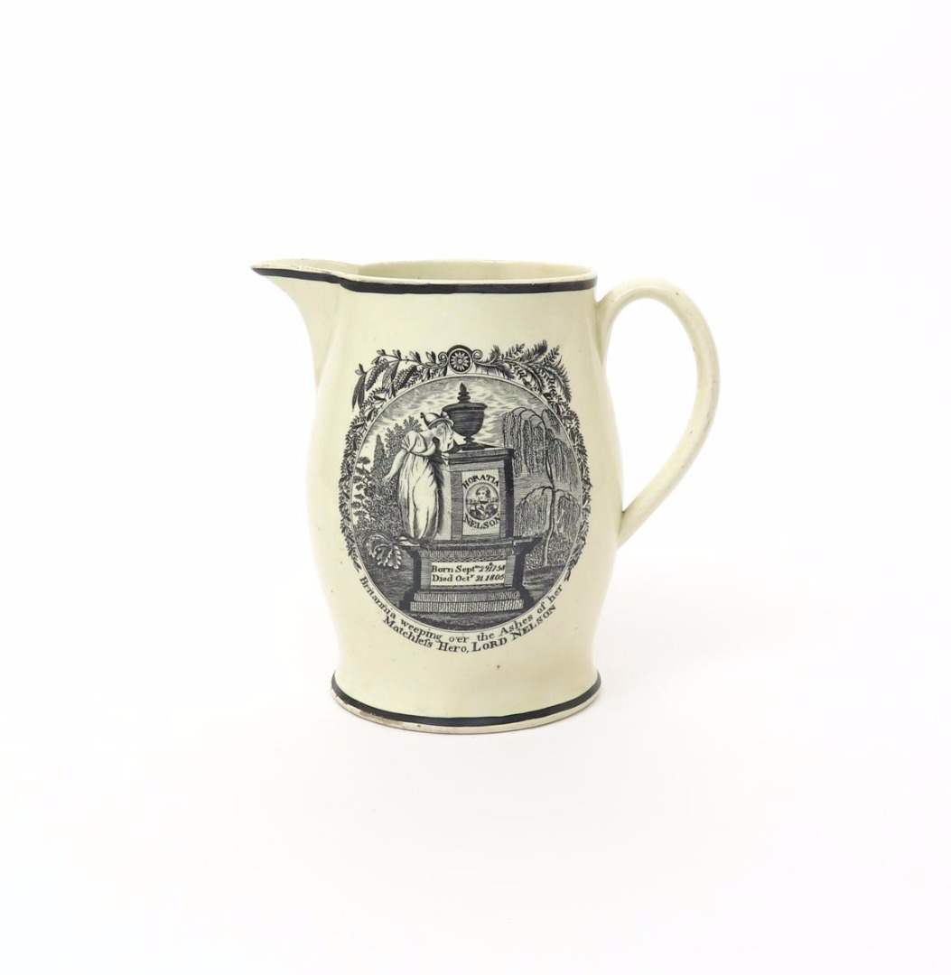 A creamware commemorative jug c.1805, printed in black in memory of Lord Nelson, one side with Britannia weeping beside a tomb bearing Nelson's dates and portrait, the reverse with a three masted ship above the banner 'Success to Trade', among the banner further reading 'EVB No. 43, To V, W No. 6', 20cm high.