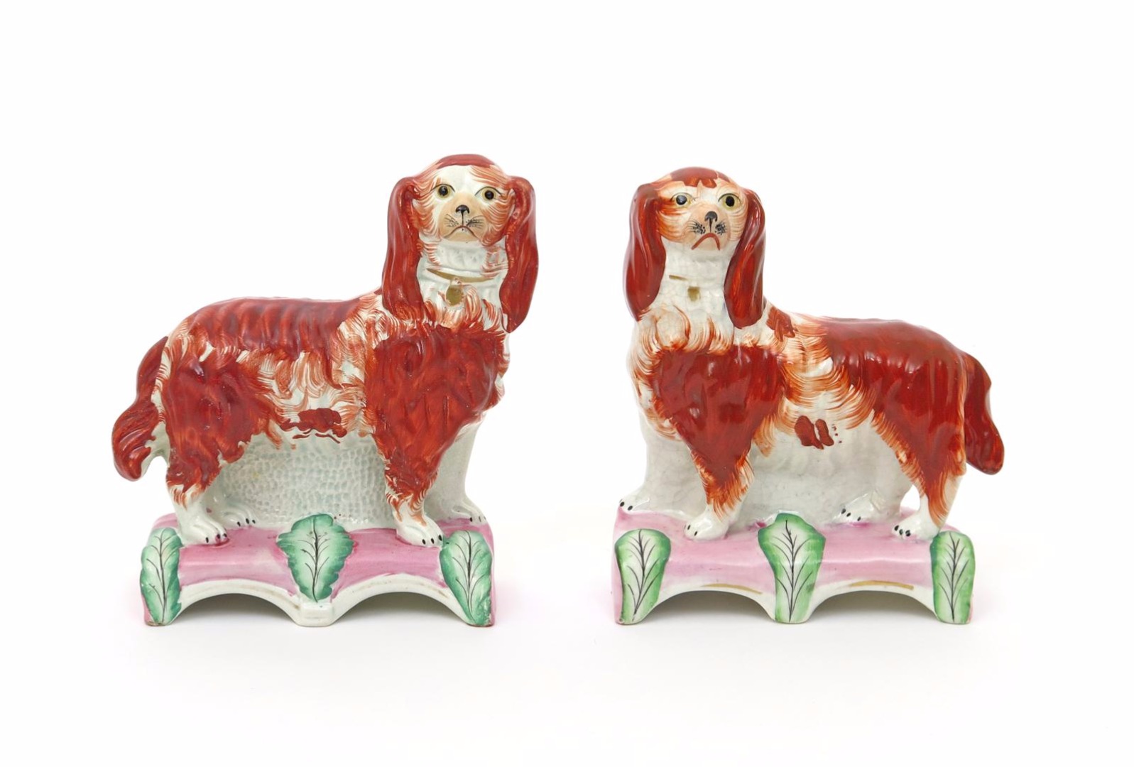 A rare near pair of Staffordshire spaniels 'Grace' and 'Majesty' mid 19th century, each standing on a pink rectangular base with leaf detailing, with heads turned and coats decorated with large red wheels of fire, 19.5cm high. (2)