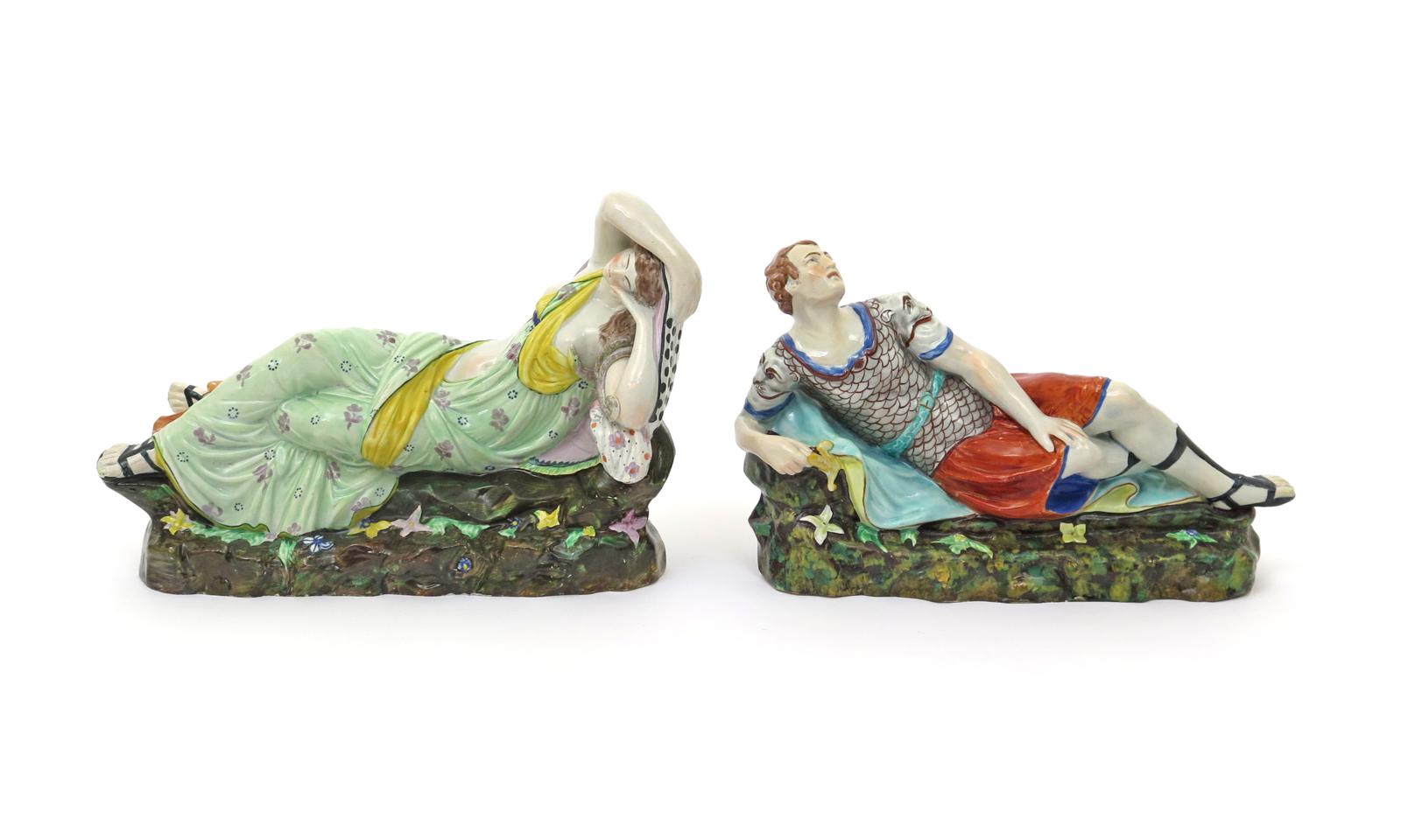 A pair of Staffordshire figures of Antony and Cleopatra early 19th century, each reclining on a low base decorated with flowers, Mark Antony wearing a chainmail tunic with lion mask motifs to the shoulders, Cleopatra with an asp curled around the top of her left arm, some good restoration, 34cm. (2)