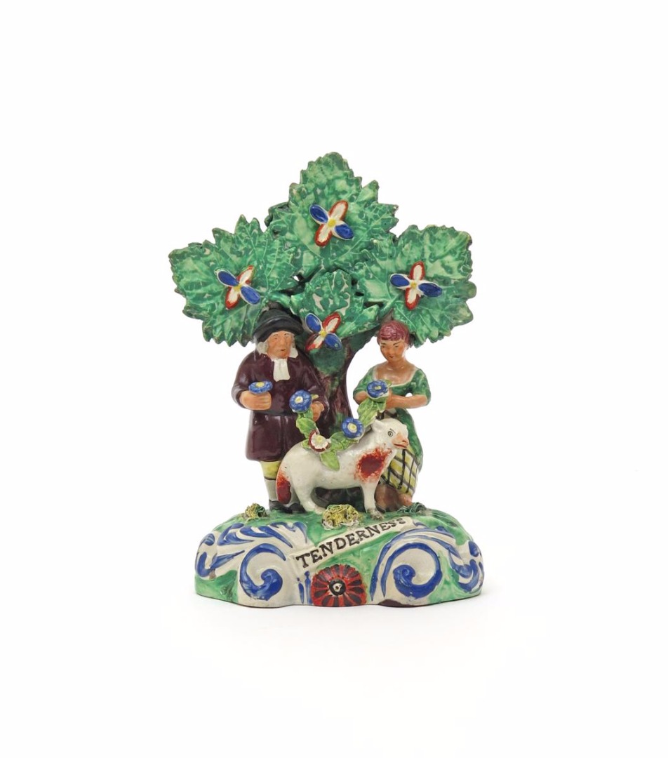 A good Walton Staffordshire figure group of Tenderness c.1820, modelled as a couple and a sheep standing beneath large-leaved flowering bocage and holding a garland of flowers, titled to the front of the scrolled base, impressed mark to the reverse, 18.5cm.