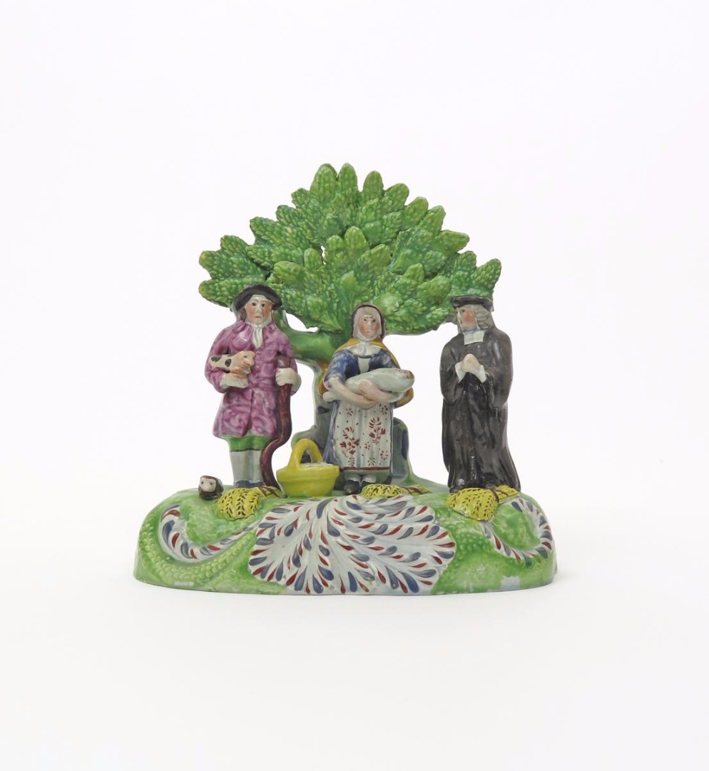 A Staffordshire Tithe Pig figure group c.1820, of a couple and clergyman standing beneath leafy bocage, the man holding a piglet, the woman a baby, sheaves of corn and a basket of eggs at their feet, raised on a scrolled base with so-called 'patriot' decoration in red and blue on white, some good restoration to the bocage, 18cm.