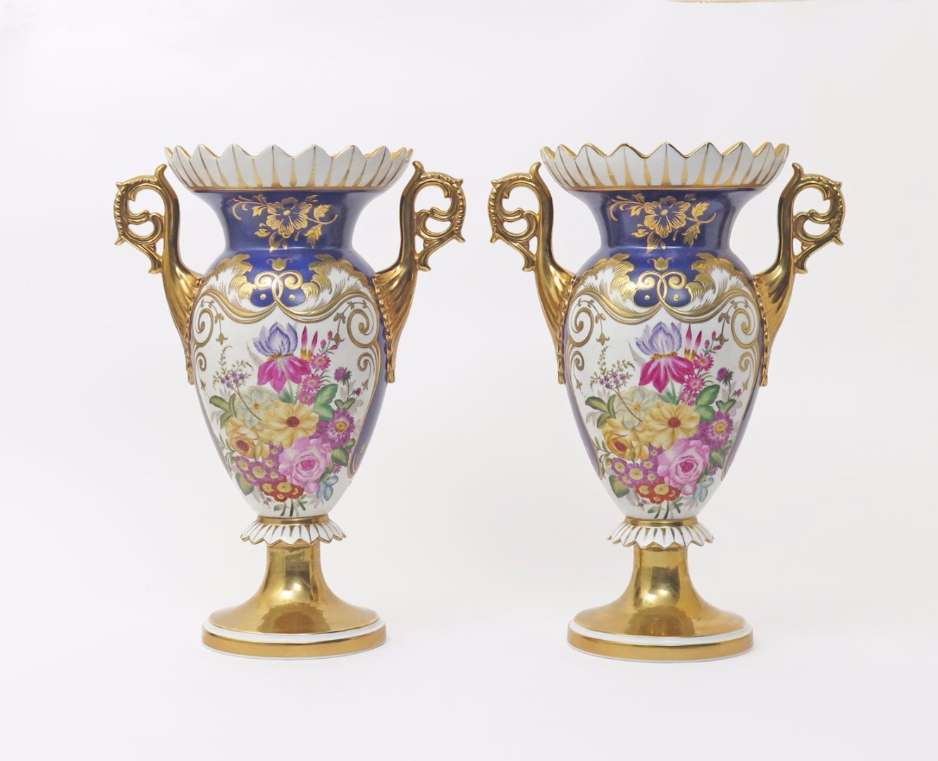 A large and impressive pair of Continental porcelain vases late 19th/20th century, perhaps Russian, brightly enamelled with arrangements of European flowers to two sides within gilded panels reserved on a blue ground, the flared rims with petal mouldings, spurious marks for the Gardner factory, 49.7cm. (2)