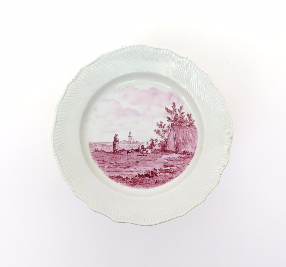 A Tournai plate c.1765-70, painted probably by Duvivier, in puce monochrome with a figure standing beside frolicking goat kids and a large recumbent bull in a rural landscape, the shaped rim with narrow spiral moulding, blue crossed swords and Xs mark, 24.5cm.