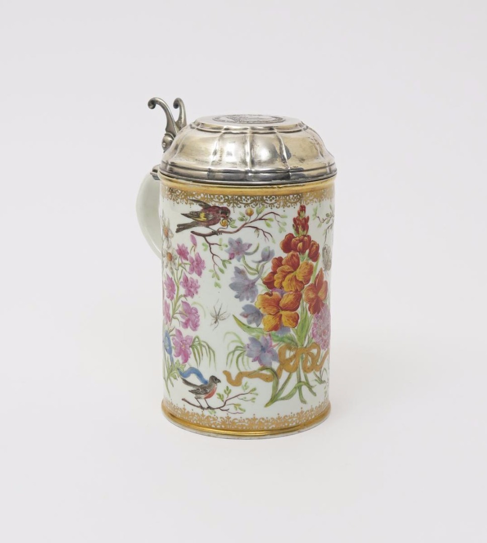 A Meissen style tankard 19th century, the tall cylindrical form boldly painted with birds and butterflies around large floral sprays tied with coloured ribbons, the neck with a Dutch silver mount and hinged lid bearing a roundel of Augustus the Strong, 20.2cm.