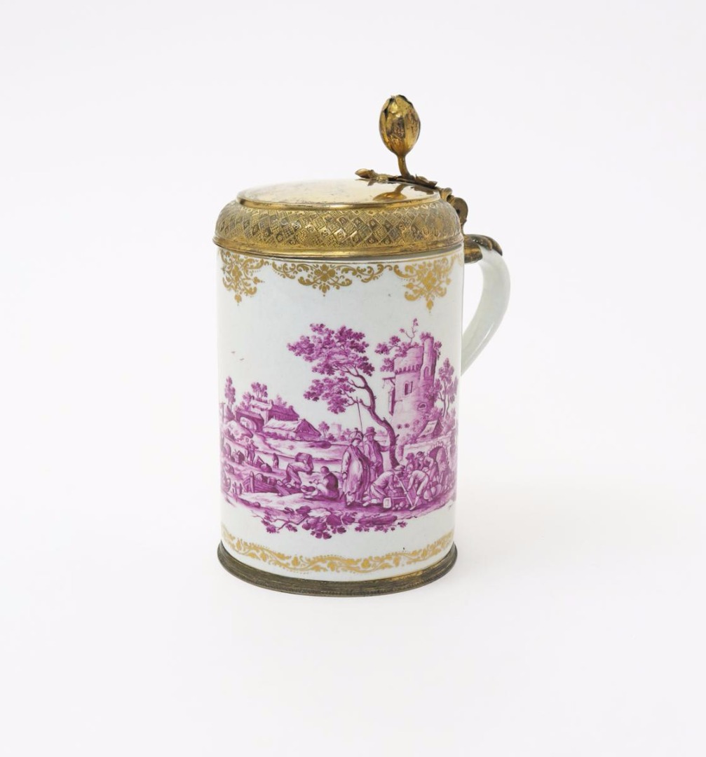 A large Meissen style tankard probably 19th century, painted in purple monochrome with a continuous scene of merchants and other figures in a busy harbour, the neck and foot with formal gilt foliate designs, with gilt metal mounts and a hinged lid with a floral finial, blue crossed swords mark, a little good restoration, 22cm.