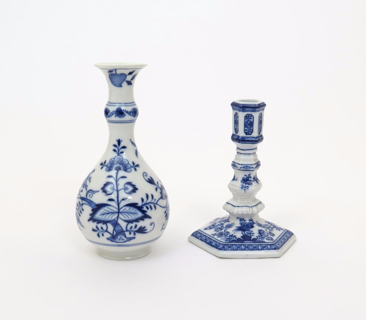 A Meissen hexagonal candlestick 20th century, the knopped form painted in blue with the Fels und Vogel pattern of a bird on feathery branches, and a small bottle vase decorated with the Onion or Zweibelmuster pattern, blue crossed swords marks, 16cm max. (2)