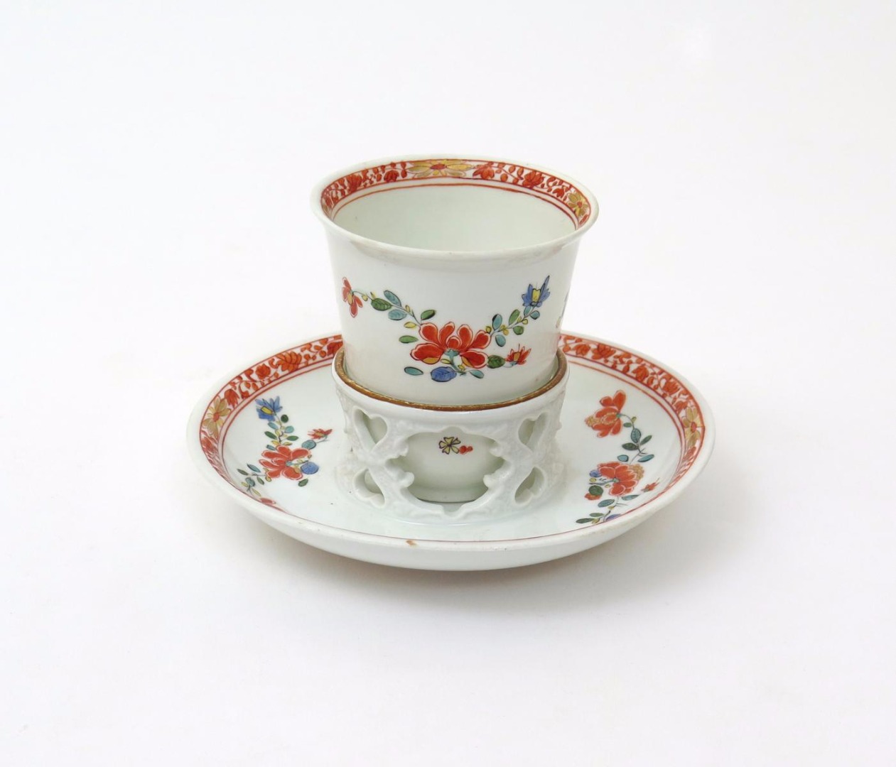 A rare Meissen beaker with trembleuse saucer c.1730, painted in the Kakiemon palette with small birds in flight among Oriental flower sprays, the rim with a narrow floral band in iron red and gilt, the saucer with a tall pierced gallery with a shaped moulded design, blue crossed swords marks, a small filled chip to the beaker's rim, 12.5cm. (2)