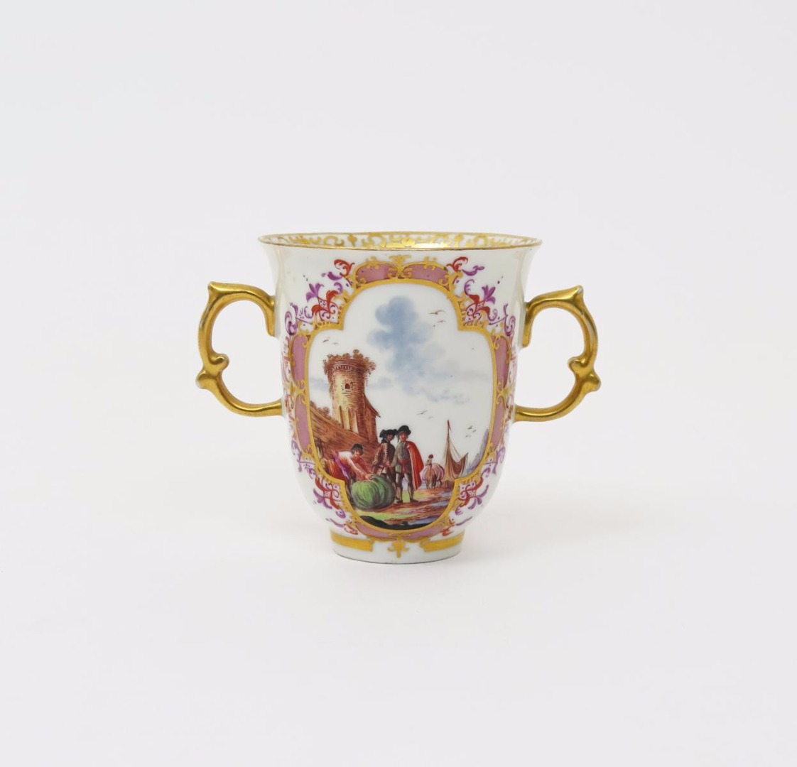 A Meissen two-handled beaker c.1725, the tall flared form painted to each side with a quatrefoil panel, one with a female pedlar and other figures before a church, the other with figures handling cloth bales in a harbour scene, reserved in borders of Böttger lustre and feathered scrollwork in red, puce and gilt, the inner rim with a wide formal gilt border, gilt 39 mark to the base, 7.7cm.
