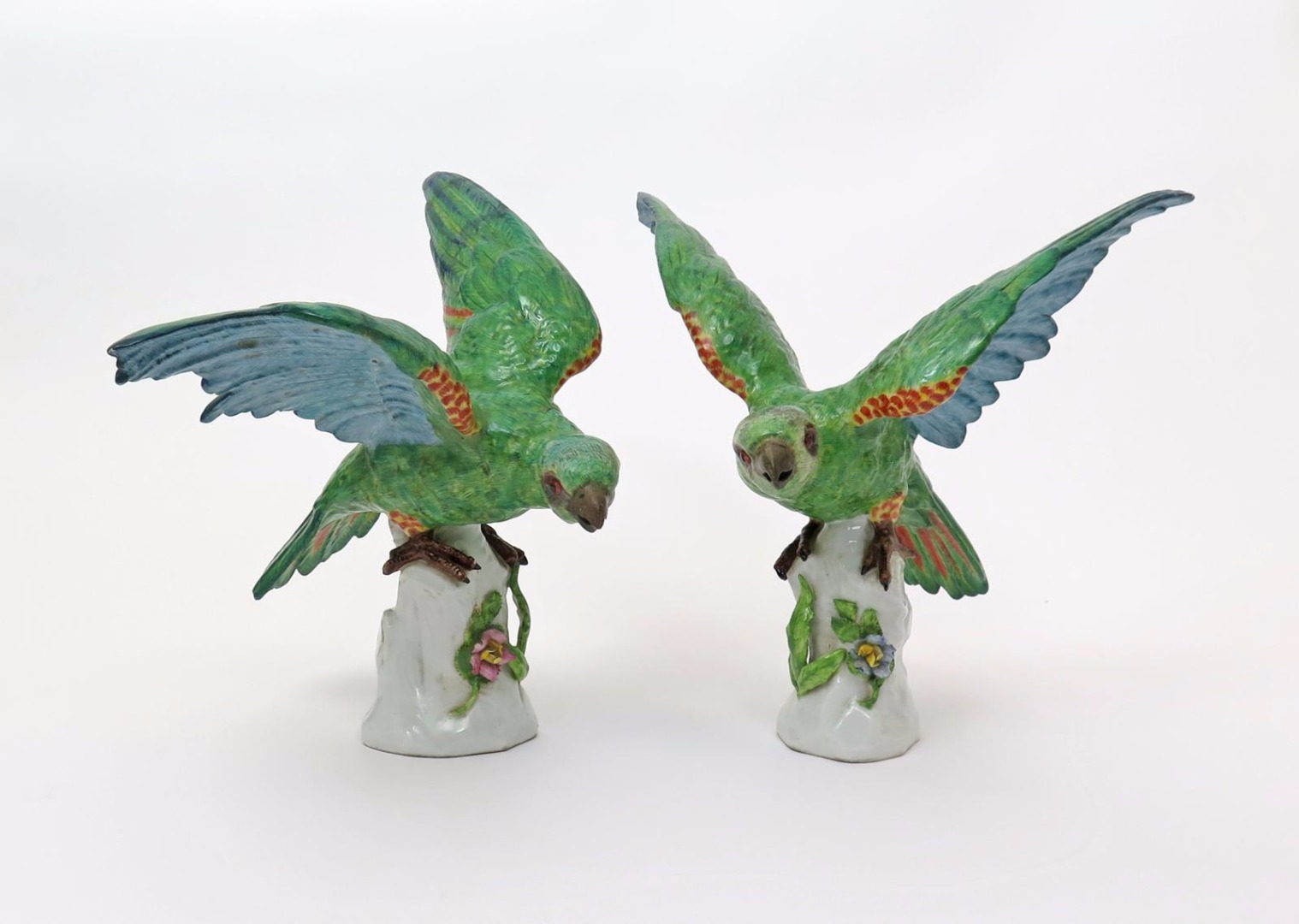 A large pair of Samson models of parakeets late 19th century, after Meissen, modelled with wings outstretched and plumage richly decorated in green with red and yellow detailing, each perched upon a stump encrusted with flowers, pseudo blue crossed swords marks, a repair to one wing, 31cm high. (2)