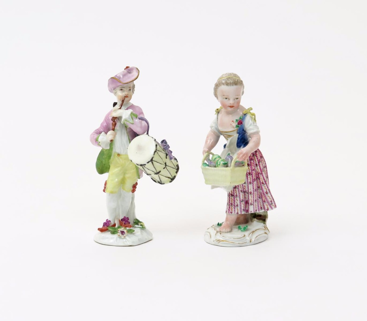 Two Meissen figures of children mid 18th century, one of a girl holding a basket of vegetables before her, wearing a patterned skirt, the other of a young musician, a drum slung over his left arm, holding the drumstick in his right hand and playing a pipe, blue crossed swords marks, 13.5cm max. (2)