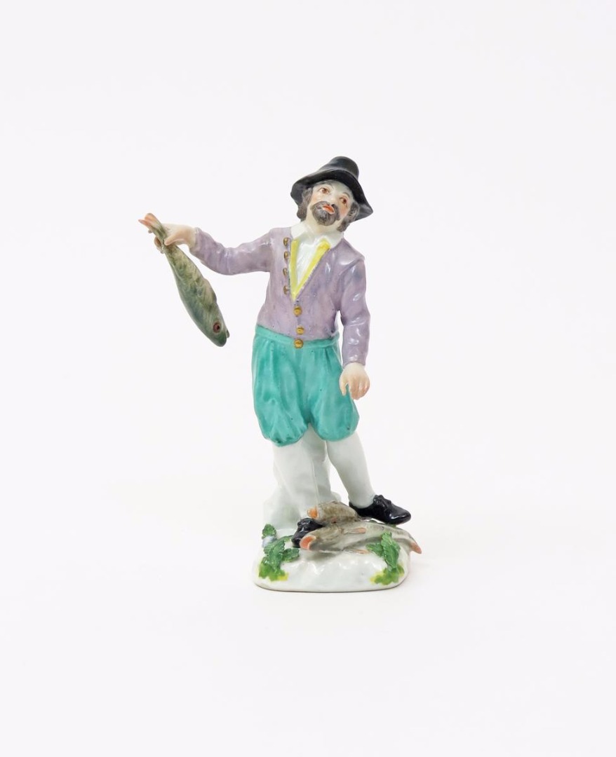 A Meissen figure of a Dutch fisherman mid 18th century, modelled by Peter Reinicke, standing with his right arm outstretched and holding the end of a large fish, two further fish on the ground in front of him, blue crossed swords mark, restored, 14.2cm.