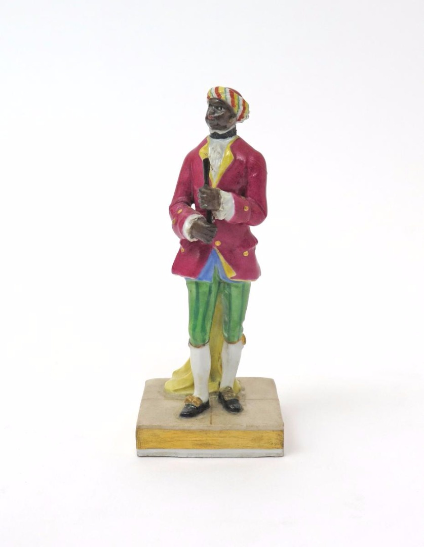 An Italian porcelain figure of a blackamoor c.1800, wearing a puce frock-coat and green striped breeches, raised on a square gilded base, some restoration, 10.5cm.