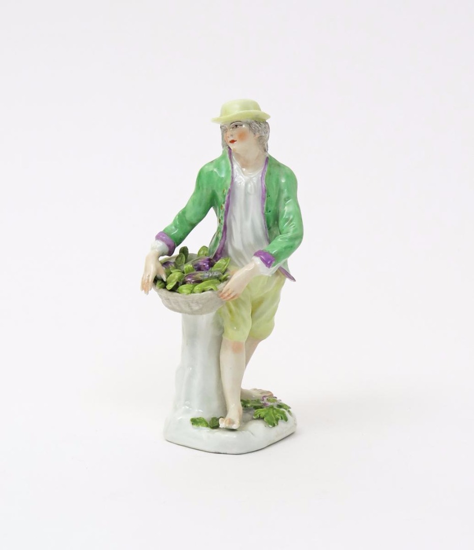 A Samson figure of a vegetable seller late 19th century, after Kändler's models at Meissen for the Cris de Paris series, standing barefoot with a basket of gourds and other vegetables to his right side, wearing a green coat over yellow breeches, the pad base applied with flowers and leaves, pseudo blue crossed swords mark, 18cm.