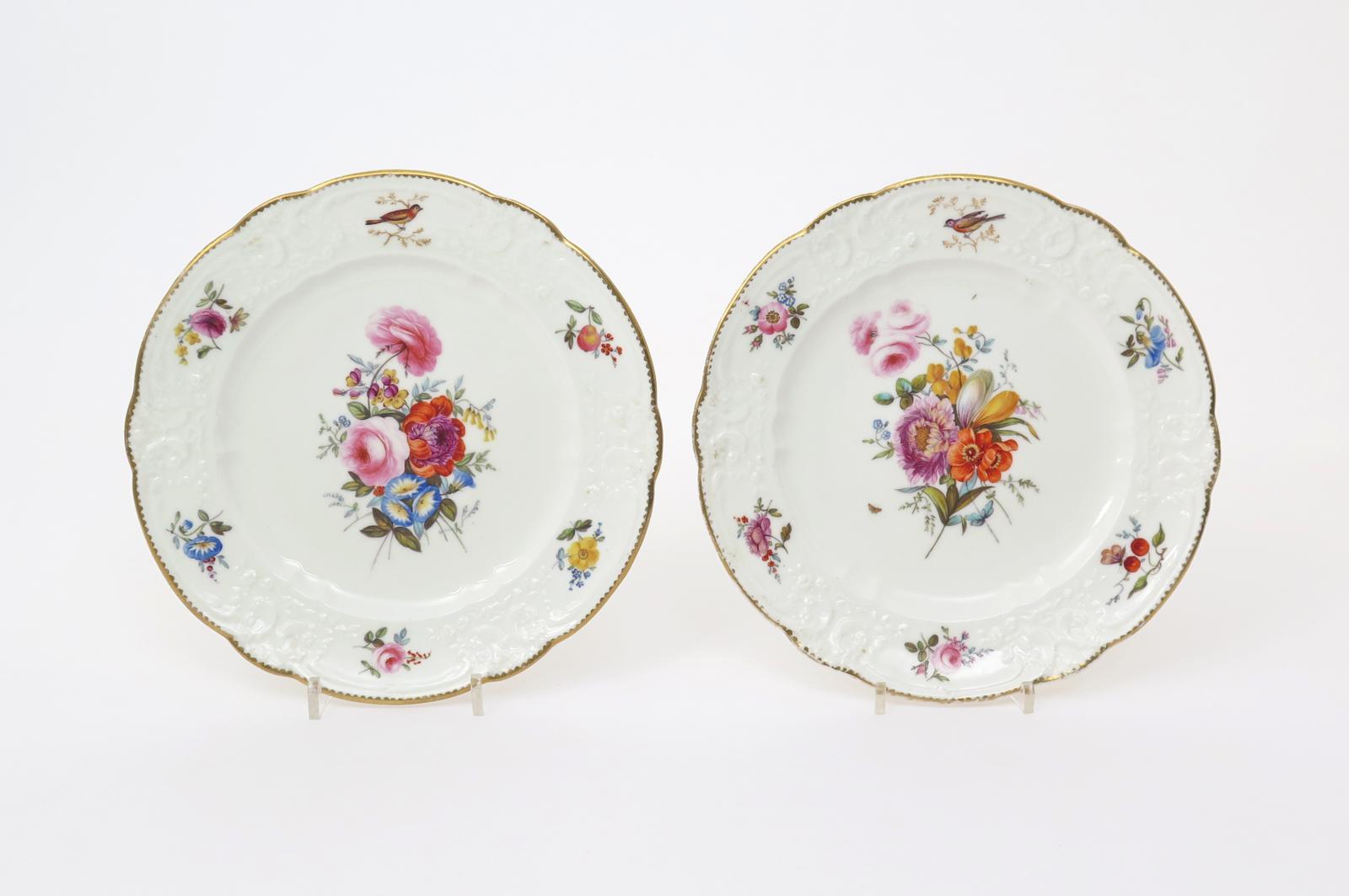 A pair of Nantgarw plates c.1817-20, of Brace Service type, painted in London in the Bradley workshop with a central spray of flowers, the rims moulded with flowers and C scrolls reserving six panels painted with a bird, floral sprigs and a spray of cherries and a peach, one with butterflies to the reverse disguising a firing fault, impressed NANTGARW CW marks, 25cm. (2)