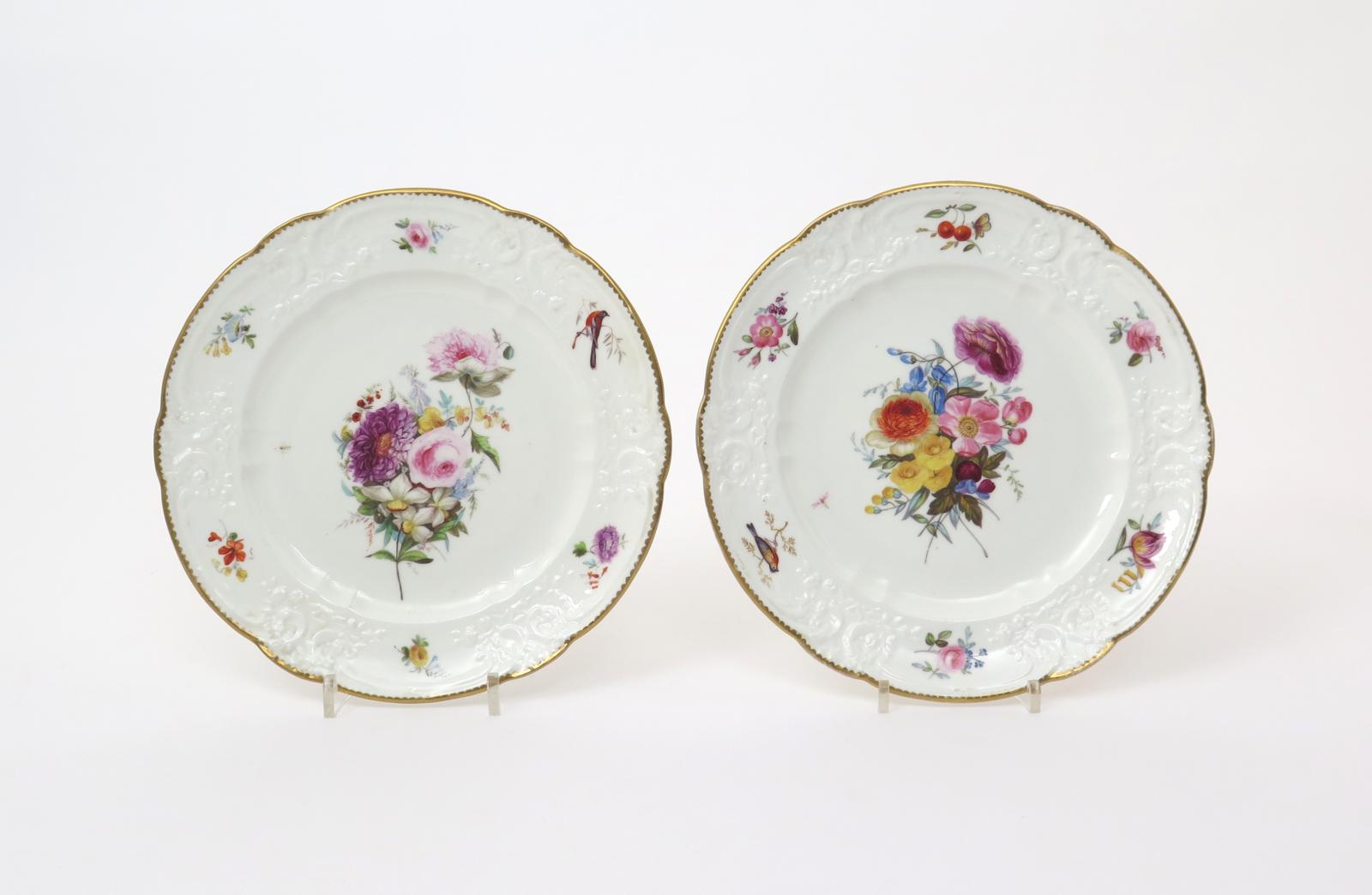 A pair of Nantgarw plates c.1817-20, of Brace Service type, painted in London in the Bradley workshop with a central spray of flowers, the rims moulded with flowers and C scrolls reserving six panels painted with a bird, floral sprigs and a spray of cherries, impressed NANTGARW CW marks, 25cm. (2)