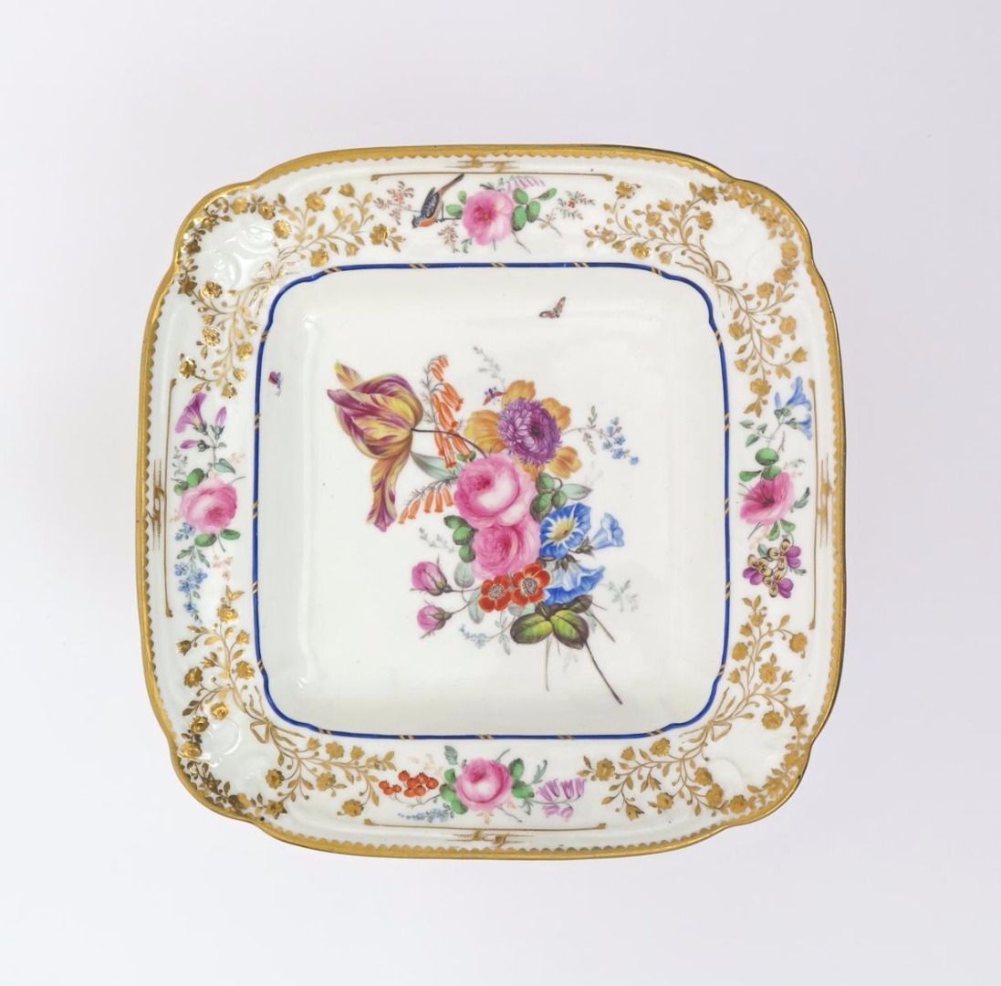 A rare Nantgarw square dessert dish c.1818-20, London-decorated in the Bradley workshop with an upright floral bouquet in the Brace service manner, including divergent tulip, rose, forget-me-not and convolvulus, the rim moulded with C scrolls and flowers picked out in gold around panels of further flowers and a single bird, faintly impressed NANTGARW CW, 24cm.