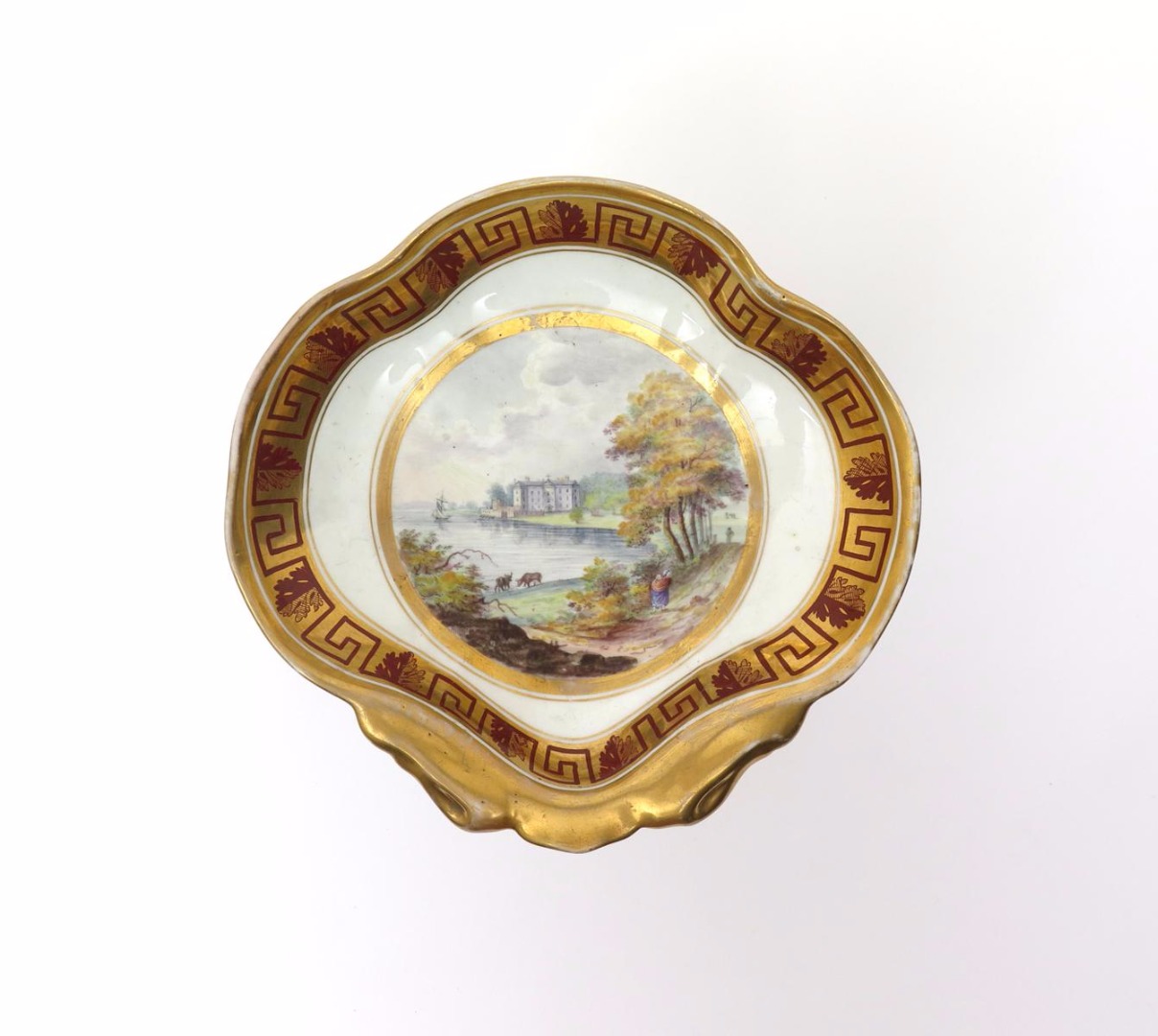 A good English porcelain topographical dessert dish early 19th century, of shell shape, decorated with a mother and child standing beneath autumnal trees by the water's edge, a view of Shane's Castle in the distance, the rim with a Greek key and palmette border in gilt and rust orange, titled in red to the underside, 20cm.