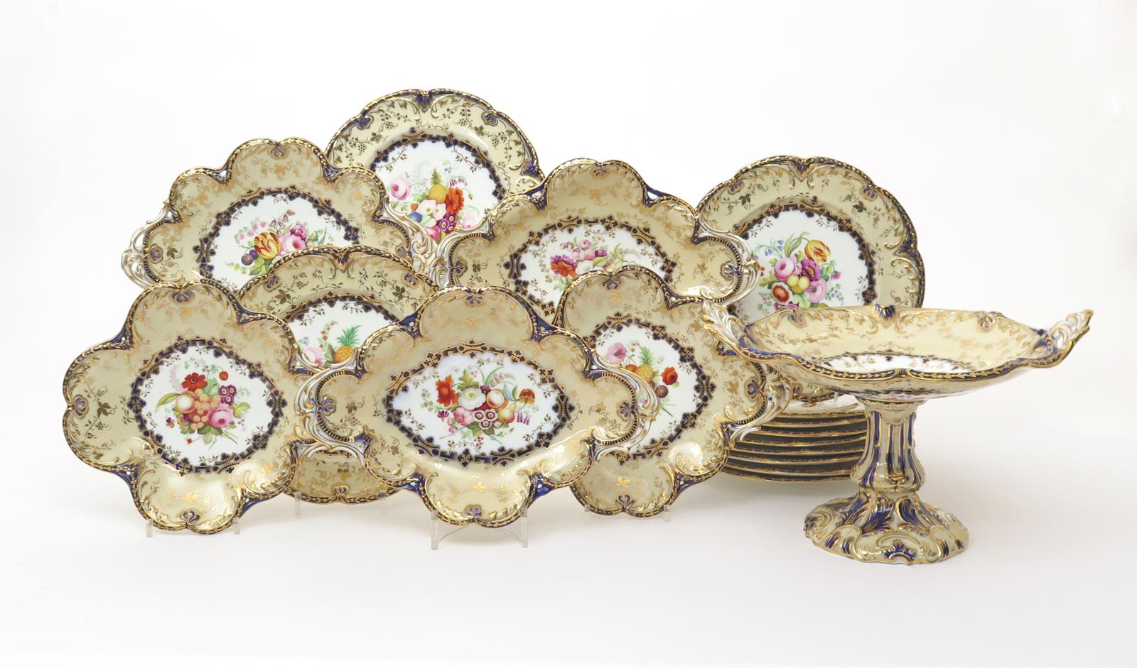 A Coalport part dessert service c.1840, the wells brightly painted with sprays of fruit and flowers, the lobed rims moulded with foliate scrolls and highlighted in gilt on a café au lait ground with cobalt border, gilt 4/781 marks. Comprising: a high tazza, three pairs of shaped dishes, and eighteen plates. (25)