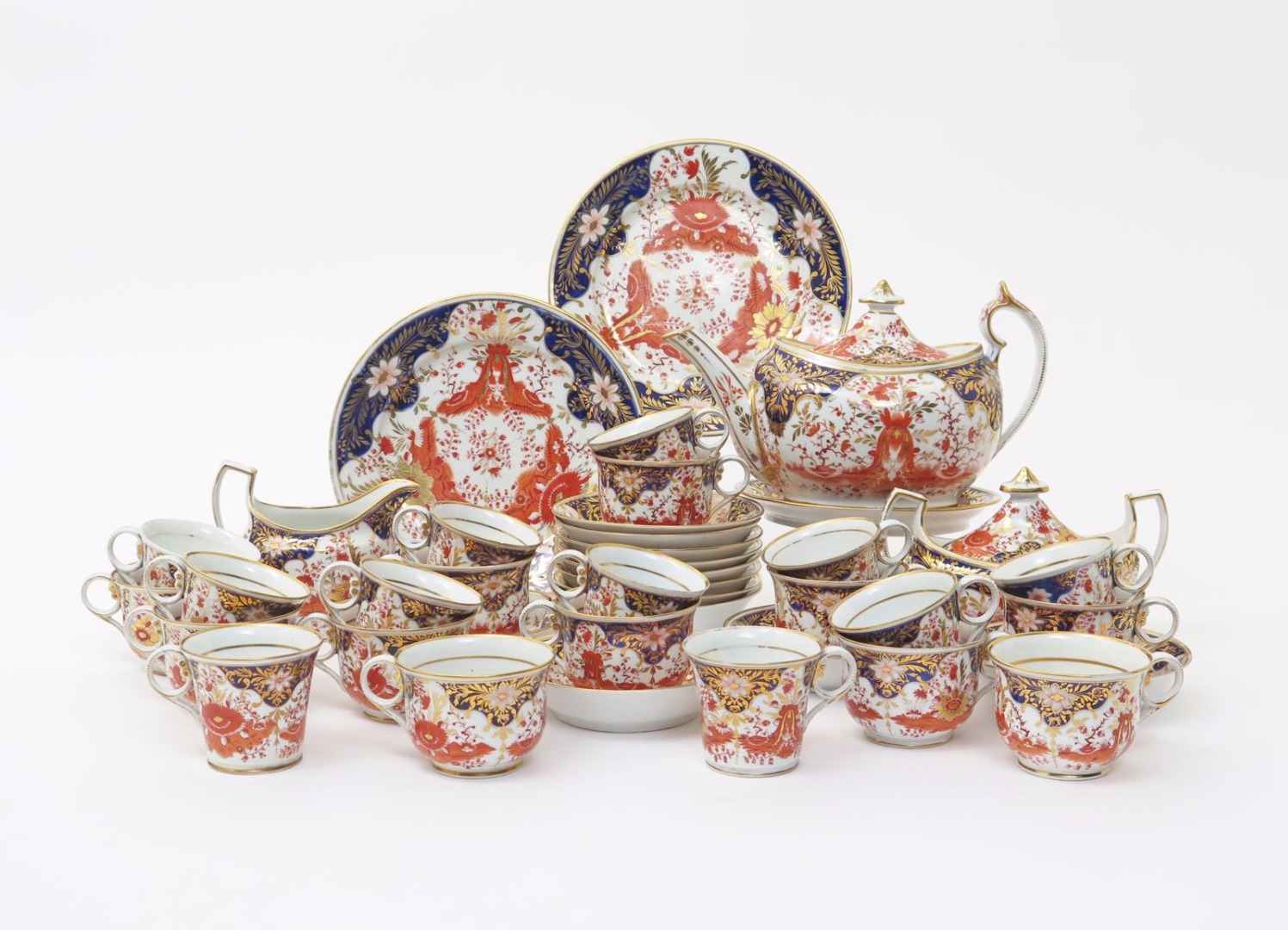 A Chamberlain Worcester tea and coffee service c.1810, richly decorated in the Imari palette with pattern 544, a formal design of red and gilt flowering plants within shaped blue and gilt foliate panels, painted script mark to some pieces, painted pattern number, minor damages. Comprising: a teapot with cover and stand, a sucrier and cover, a milk jug, a slop bowl, two plates, twelve tea cups, twelve coffee cups and twelve saucers. (45)
