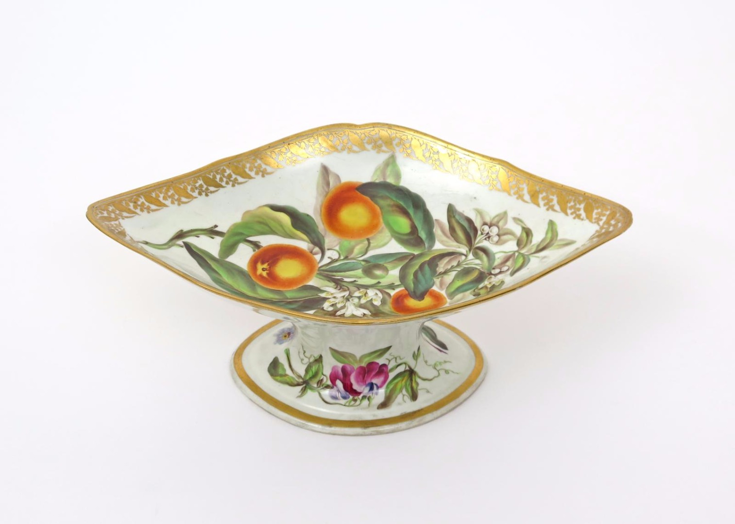 A good Derby botanical centrepiece or tazza c.1796-1800, well painted in the manner of William 'Quaker' Pegg with a bold specimen of a fruiting orange branch within a gilt foliate rim, the spreading foot with specimens of Sweet Pea and Blue Aster, titled in blue to the base, two small chips to the underside of the rim, 34.3cm across.