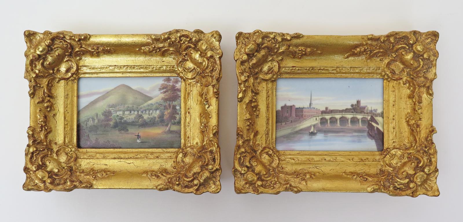 A small pair of Grainger Lee & Co. Worcester topographical plaques c.1825-30, the rectangular forms finely painted, one with a view of Worcester showing the Severn bridge and cathedral, the other with a distant view of Malvern, two figures promenading in the foreground with the town nestling before hills behind, iron red script marks and titled to the reverse, some clean crazing, the plaques 7cm x 10.5cm. (2)