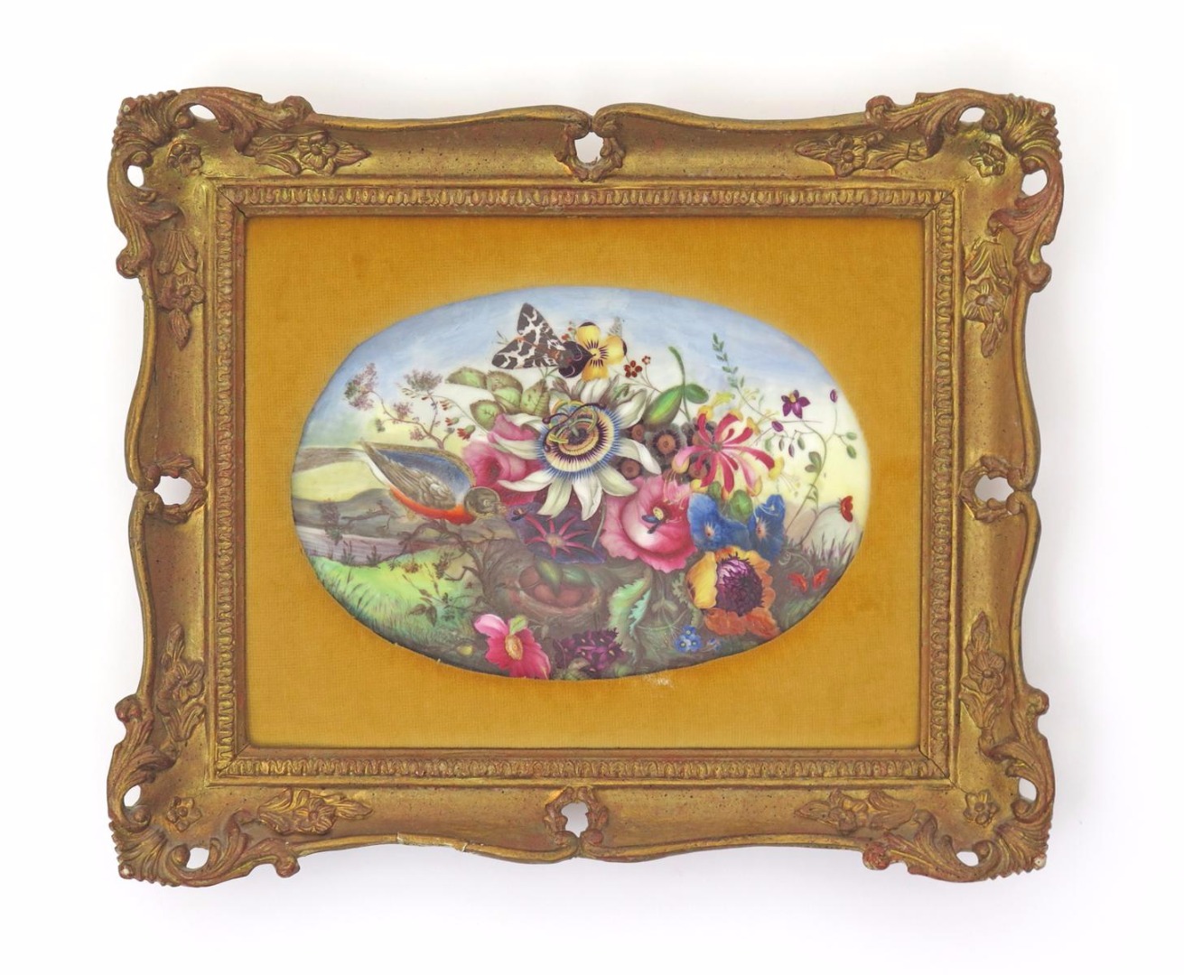 An English porcelain plaque c.1825, perhaps Derby, painted with a bullfinch perched above a nest of eggs bewneath a bold arrangement of flowers including honeysuckle, heartsease, passion flower and auricula, with flying insects about, signed to the reverse 'J.B. March 24th 1825', in a velvet and gilt wood frame, some restoration, 27.2cm x 33.2cm overall.