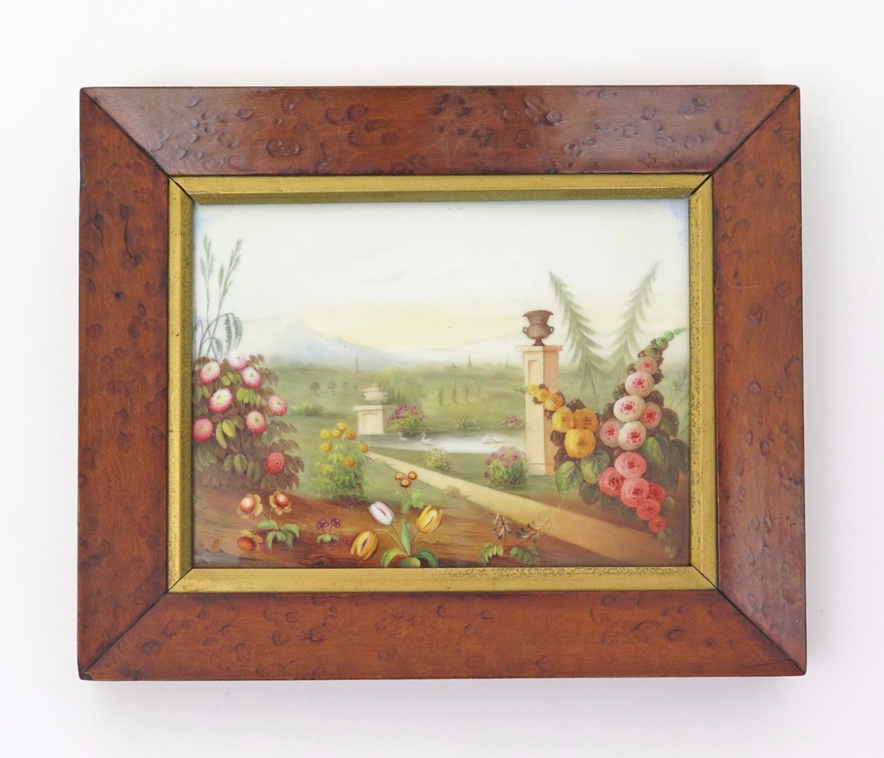 An English porcelain rectangular plaque 19th century, perhaps Derby, painted with a formal garden landscape, with swans on a large pond between stone urns on tall plinths, with pale mountains in the distance, within a burr wood frame, the plaque 13cm x 18cm.