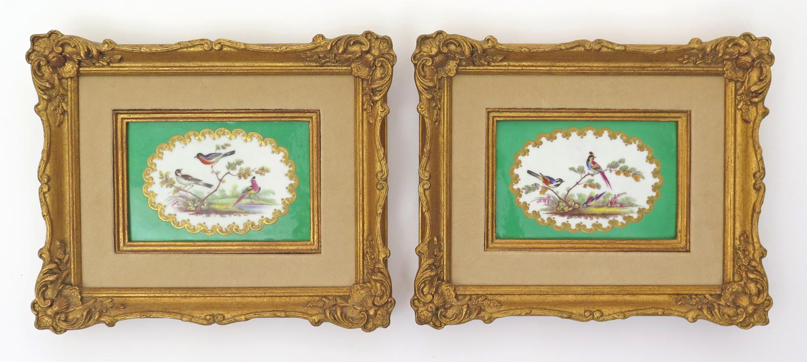 A pair of Derby porcelain plaques c.1835, attributed to Horatio Steele, each painted in the Sèvres manner with colourful birds perched on and beneath leafy branches, reserved in a gilt C scroll cartouche on an apple green ground, the plaques 10.5cm x 16.5cm. (2)