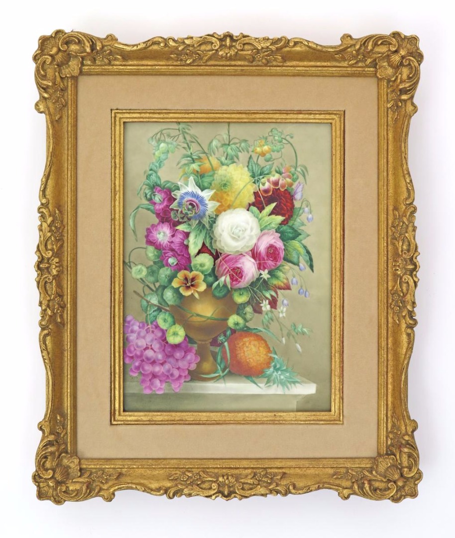 An English porcelain rectangular plaque 19th century, finely painted with a vase of flowers including nasturtium, chrysanthemum, hollyhock and passionflower, resting on a white stone ledge beside a large bunch of grapes and a pineapple, within a gilt wood and velvet frame, the plaque 26cm x 19cm.