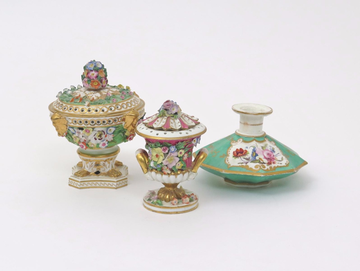 Two Bloor Derby pot pourri vases and covers c.1825-30,the larger applied with four mask handles above a flattened body applied with flowers on a green ground, the smaller of campana form with similar applied flowers on a puce ground, and a ten-sided bottle or flask painted with panels of flowers reserved on a green ground, some damages, 15cm max. (5)