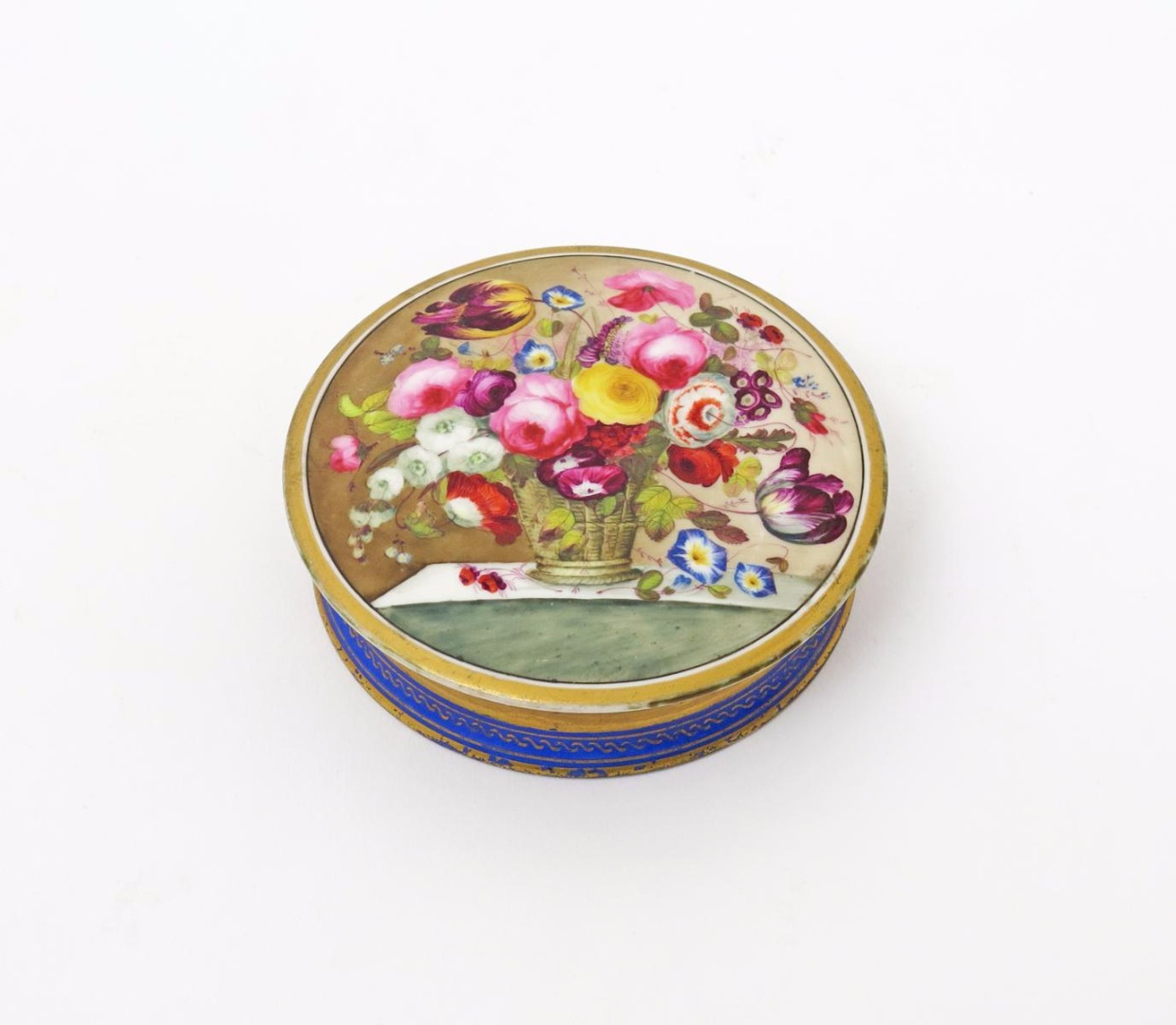 A small Derby circular box and cover c.1810, the lid finely painted with flowers including tulip, convolvulus, poppy and rose issuing from a tall basket on a marble ledge, the sides and base richly decorated with a formal gilt foliate design on a blue ground, chips to the flange, 9.5cm dia. (2)