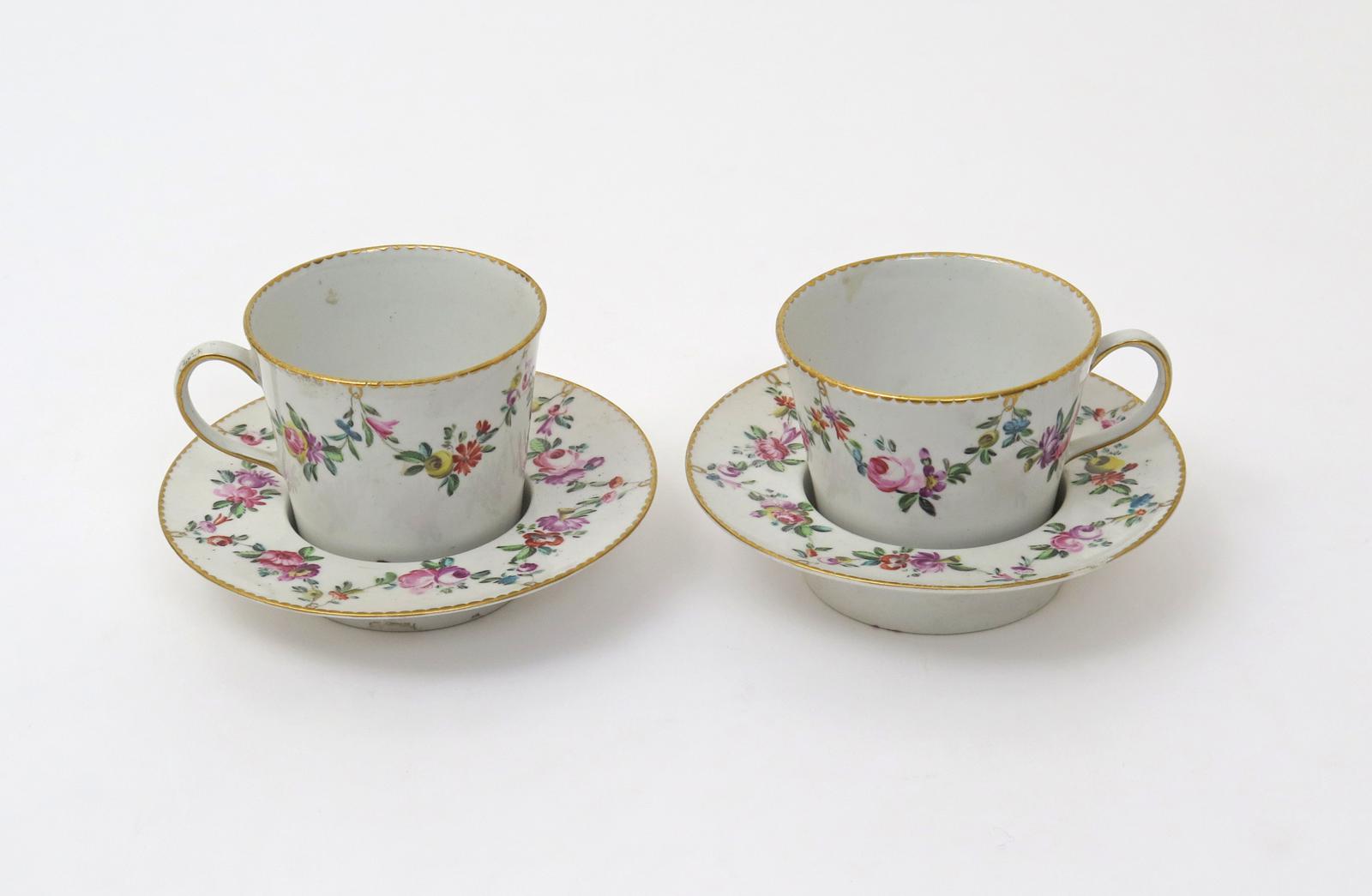 A pair of Derby chocolate cups and trembleuse saucers c.1775-80, the flared cups with simple loop handles, all painted in the Sèvres manner with polychrome flower garlands suspended from gilt dentil rims, each saucer set with a deep well, crowned D marks in blue, 12.5cm. (4)