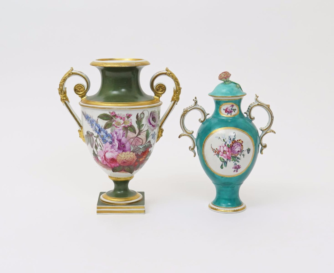 A Derby two-handled vase and cover c.1770, the ovoid form painted to each side with an oval panel of flowers, with smaller panels echoed to the neck, reserved on a sea green or French green ground, and a later Derby vase finely painted to one side with garden flowers including poppy, rose, dahlia and forget-me-not, reserved on a green ground, some restoration to the first, 29.5cm max. (3)
