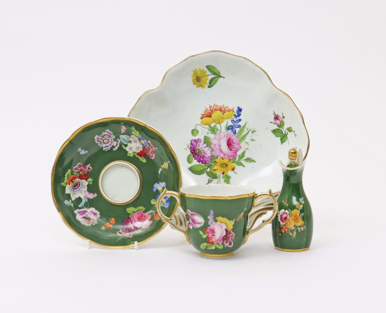A Bloor Derby two-handled chocolate cup and trembleuse saucer c.1840, finely painted with tied bouquets of flowers including primrose, passionflower, tulip, poppy and lonicera, together with a small ewer and stopper decorated in the same pattern, and a Derby dessert dish, c.1815, of shell shape, painted with a flower spray and single stems, red factory marks, 25cm max. (5)