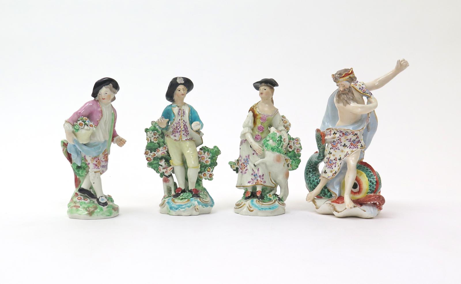 Four Derby figures c.1770-80, including a pair of a shepherd and shepherdess with a dog and a lamb, raised on low scrolled bases with turquoise and gilt highlights, a figure of Neptune standing beside a large colourful dolphin, and a gardener carrying a basket of flowers, some restoration, 15cm max. (4)