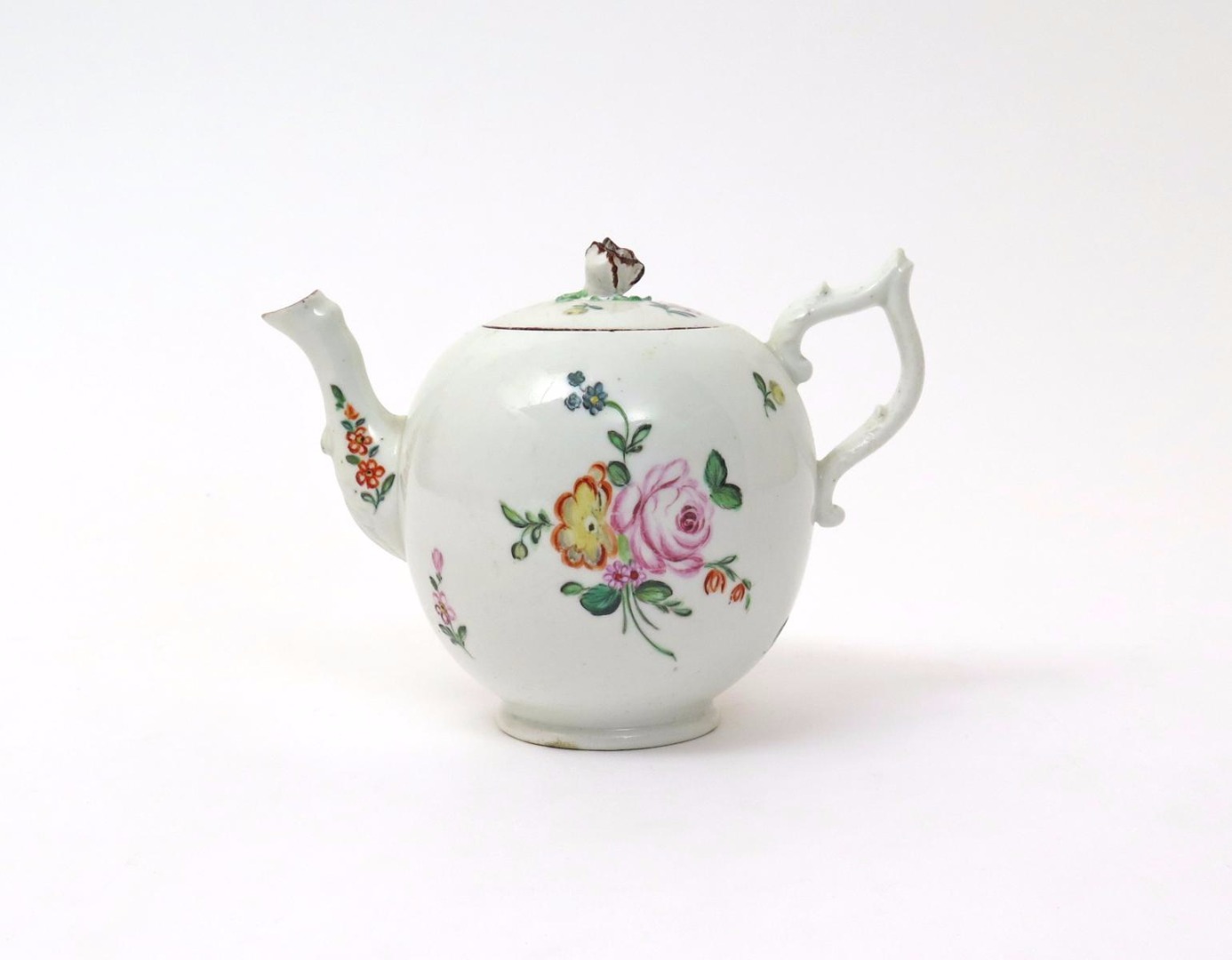A Chelsea-Derby teapot and cover c.1775, the small globular body delicately painted with simple sprays of polychrome flowers, the wishbone handle issuing from moulded acanthus leaves, with further flowers to the sides of the spout, 15.5cm across. (2)