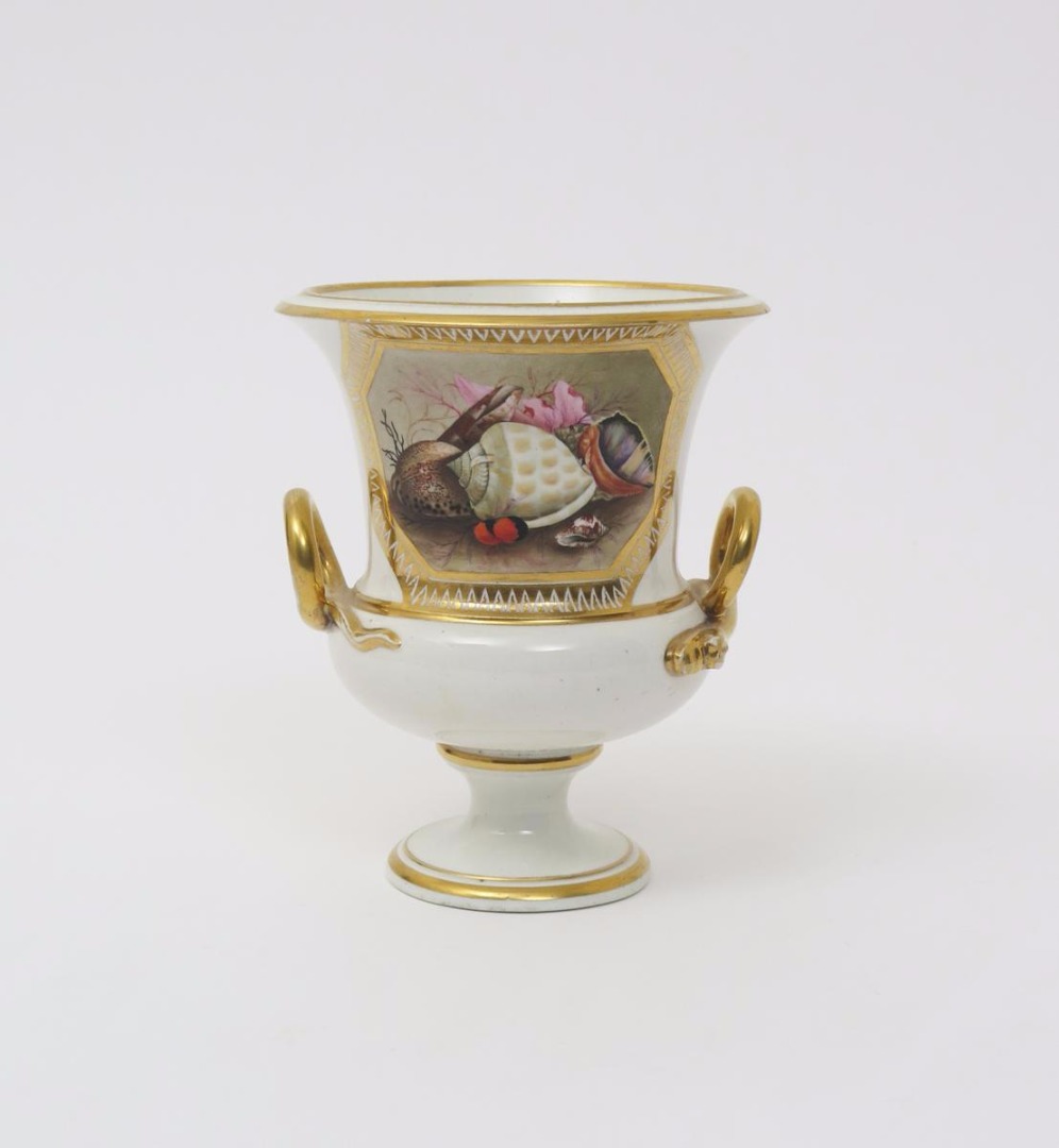 A rare Derby campana vase c.1810-15, painted to one side with an octagonal panel containing an arrangement of shells and coral, the handles each formed as a coiled serpent or lamprey, red crowned crossed batons mark and painted 36 to the foot, 17cm.