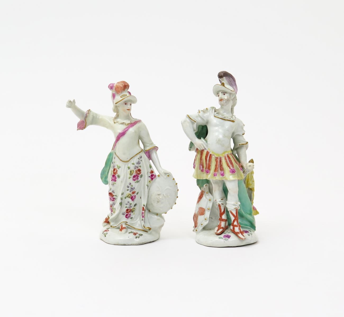 A pair of Derby figures of Mars and Minerva c.1755, each modelled in traditional pose with a shield, Mars holding the hilt of his sword, Minerva's hand outstretched to receive her spear, both raised on low oval bases painted with flowers, some damages and restoration, 17cm. (2)