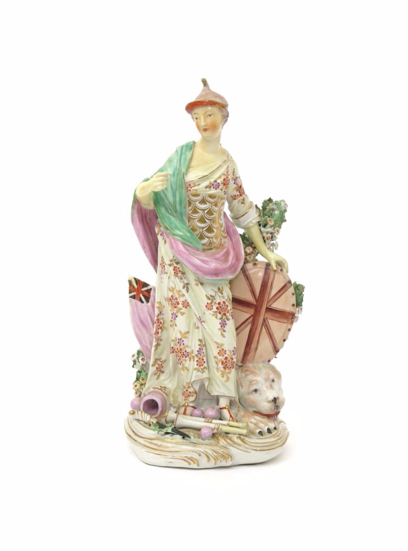 A large Derby figure of Britannia c.1770, her shield resting on the head of a recumbent lion, a dagger and bugle at her feet, raised on a low scrolled base, some restorations, 37cm.