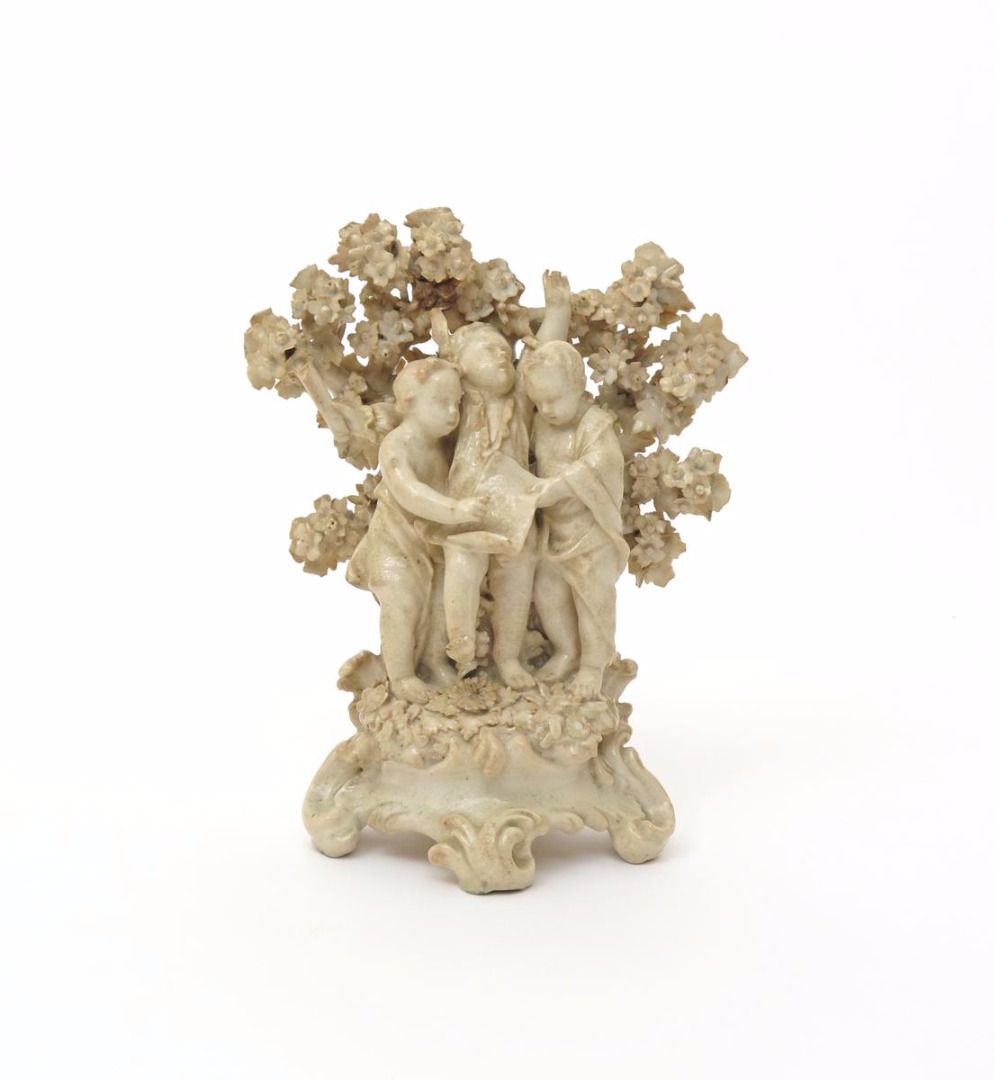 A Chelsea allegorical figure group c.1760, modelled as three putti huddled together on a tall scrolled base, two reading a scroll, while the central third raises his left hand, a furled scroll held in his right, standing before flowering bocage with further flowers to the base, impressed R mark, some damages, 25cm.